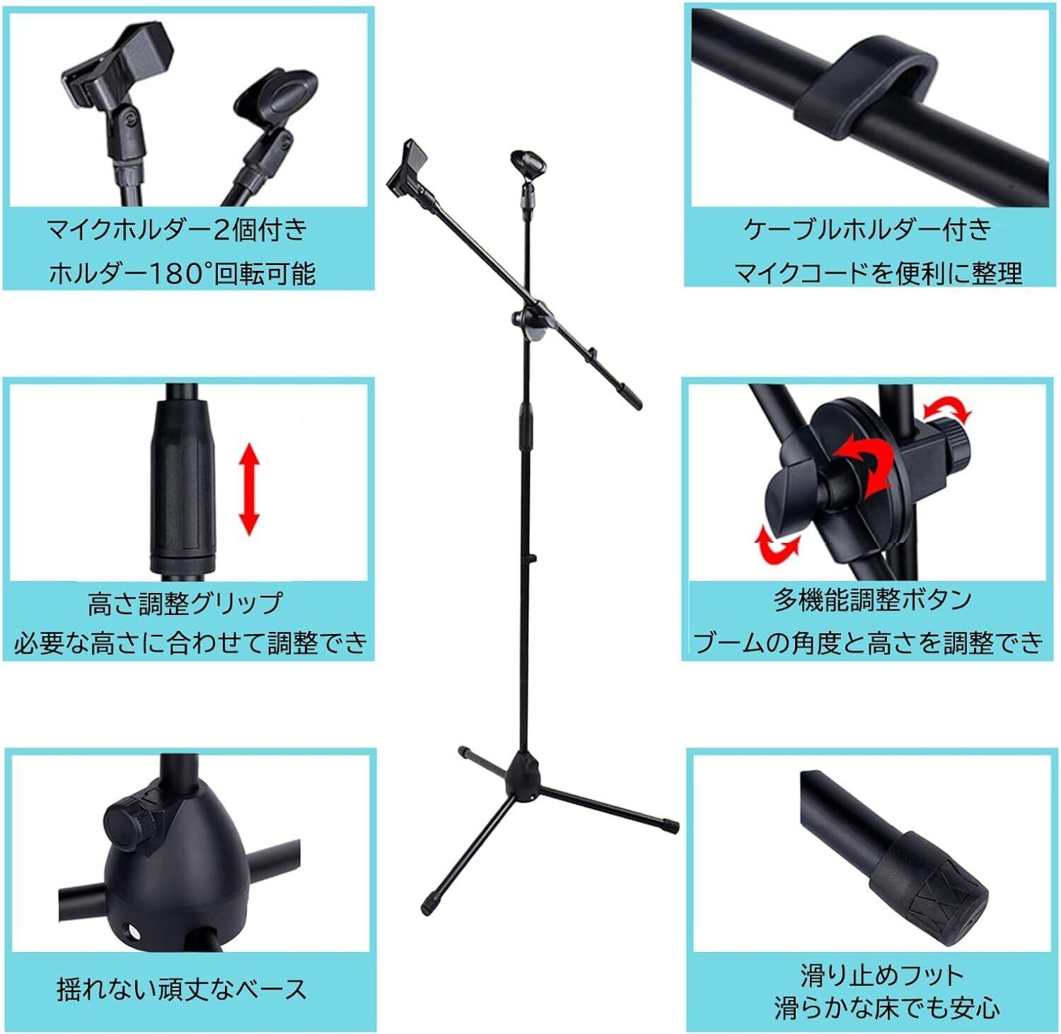 2ユニバーサルマイククリップホルダー:2は1より良いです。だからこそこの三足マイクブームスタンドは2つのクリップホールダーが付属しています!マイクスタンドに取り付け マイクを入れ レコーディングを開始します