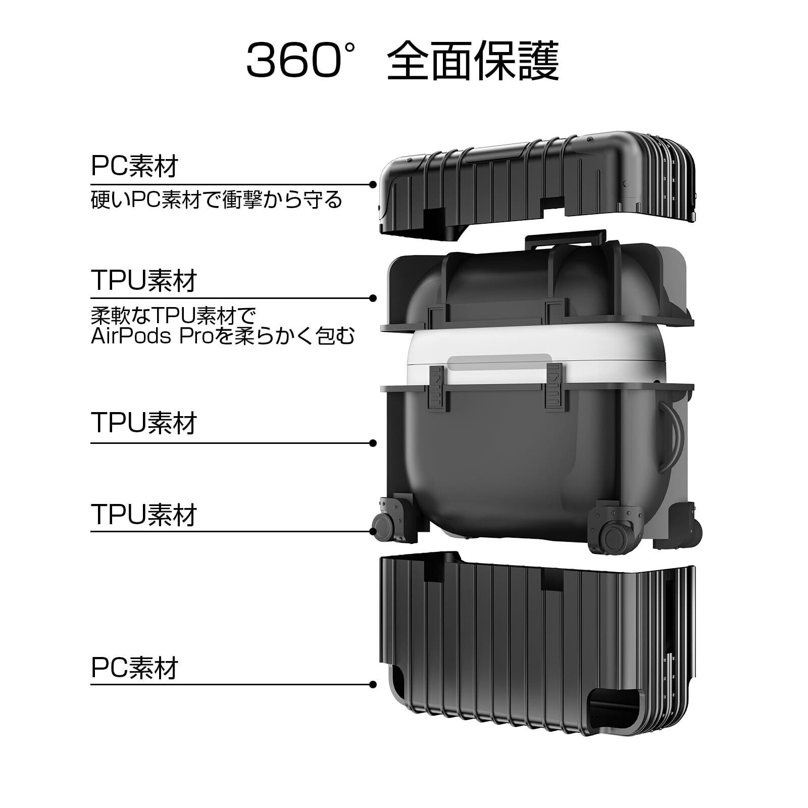 【高品質PC+TPU 2層保護&上下分体デザイン】このAirpods Pro 2ケースは高品質で柔軟なTPU素材+丈夫なPC素材で作られて、シリコンケースよりも耐衝撃、耐摩耗で、汚れにくいです。ケースは上下二部に分かれていて、Airpods Proを完全に開けるように後ろにノッチを設計しました。