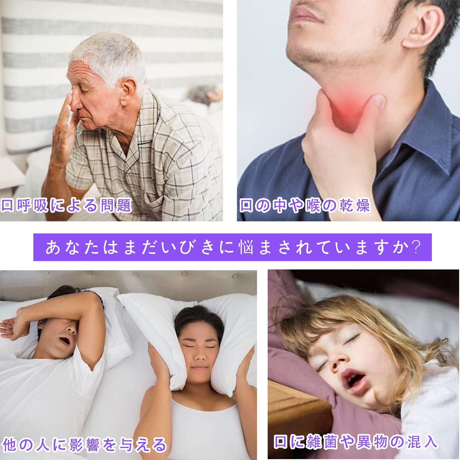 口閉じテープ・喉の乾燥防止:このいびき防止テープを使用した後、朝、起きた時の口の中の乾燥がなく気分。口が閉じたままなので、夜間の喉の渇きも軽減され、風邪をひきにくくなりました。
