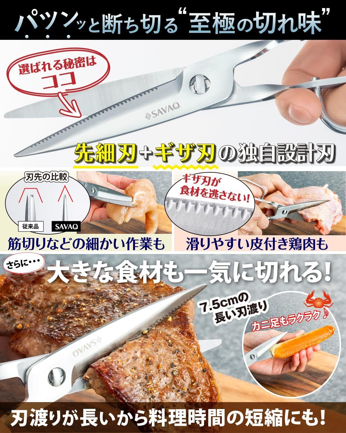 【至極の断ち心地】先細刃とギザ刃の独自設計刃で狙ったポイントを的確にカットでき、食材の断面もつぶすことなく綺麗な切り口に。 また、硬度の高いステンレス素材を使用しているので耐久性に優れ、硬いお肉の筋や、乾物系も簡単にカットできます。