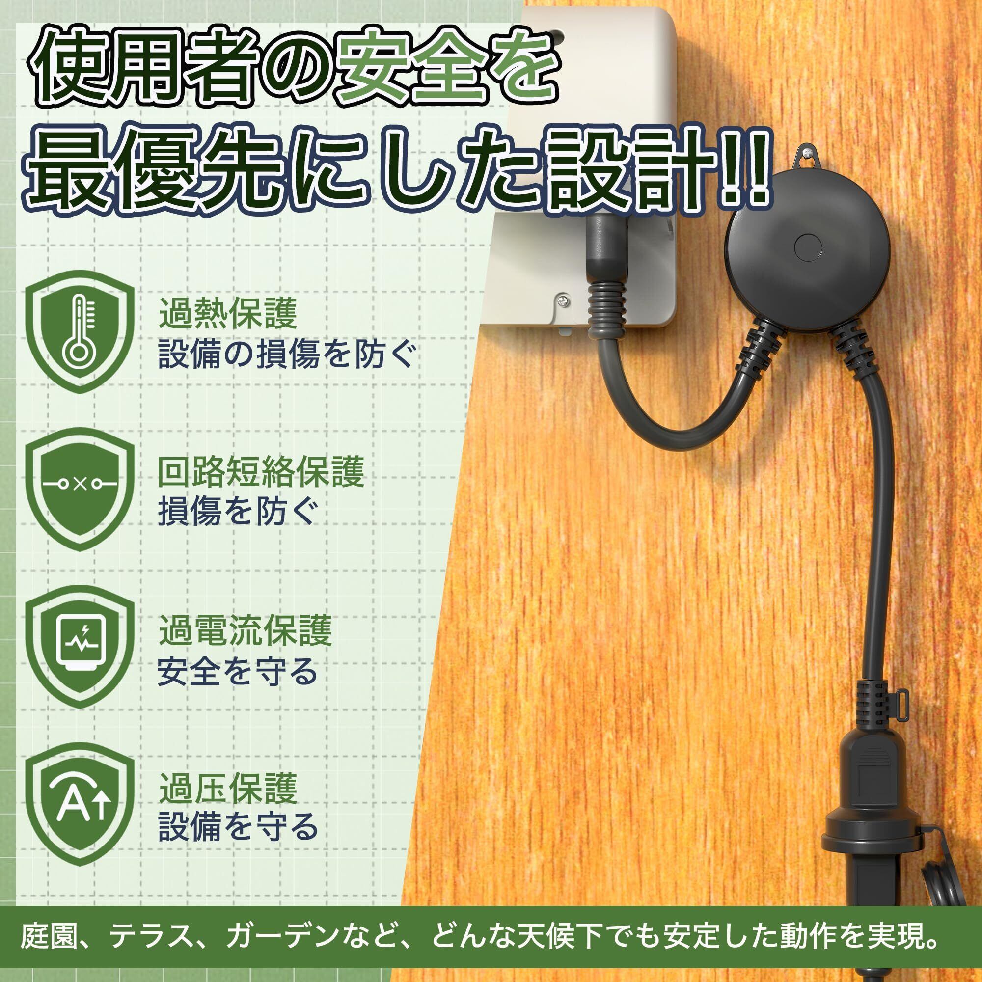 【切り忘れ防止&節電対策に最適|自動制御】 手動スイッチ不要、自動で点灯・消灯するから消し忘れの心配なし。毎日決まった時間に点灯・消灯してくれるため、防犯対策や夜間の見守りライトとしても効果的。屋外センサーライト、自動タイマーコンセント、光センサータイマーとして多用途に活躍。