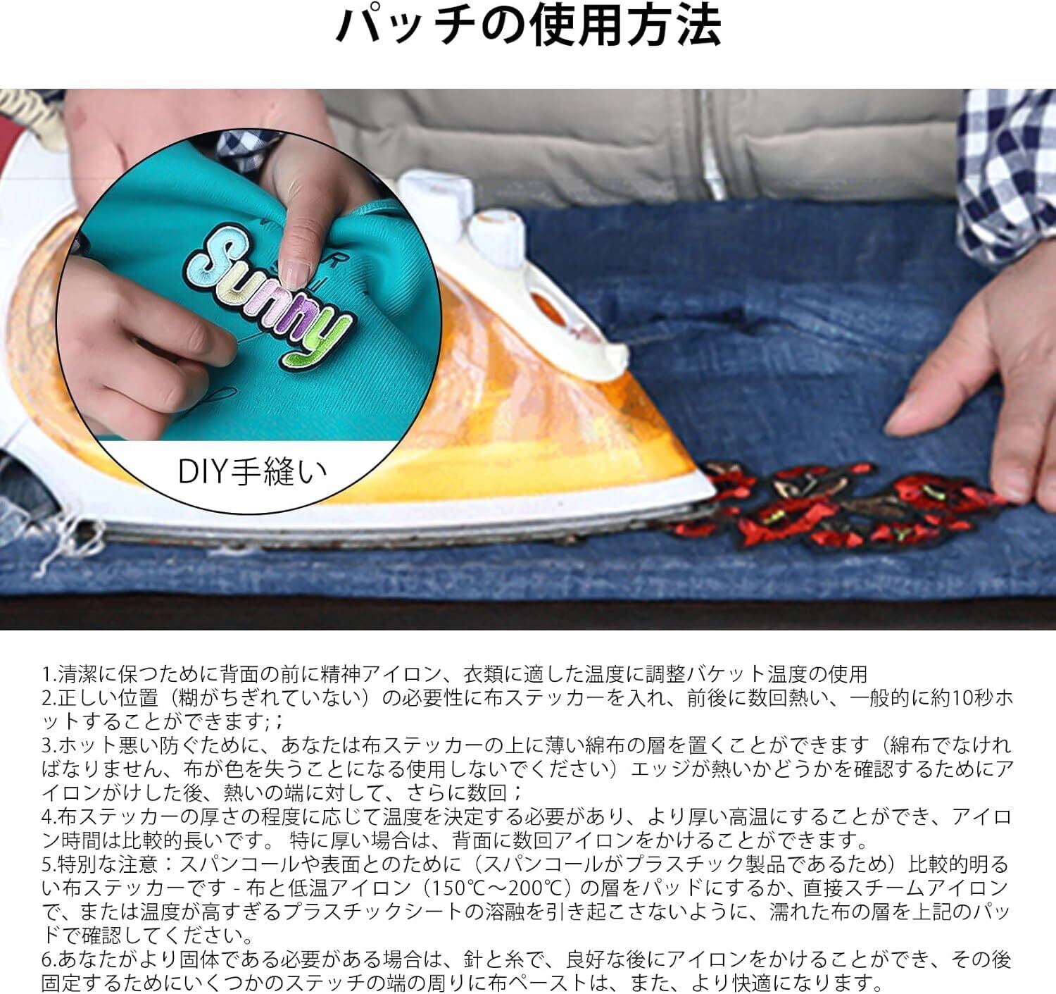 【使用方法】アイロンで簡単に取り付けられます。 もちろん接着剤でもOKです!よりきれいに仕上げるには、アイロンで縫い目を中心に貼り付けることをおすすめします。