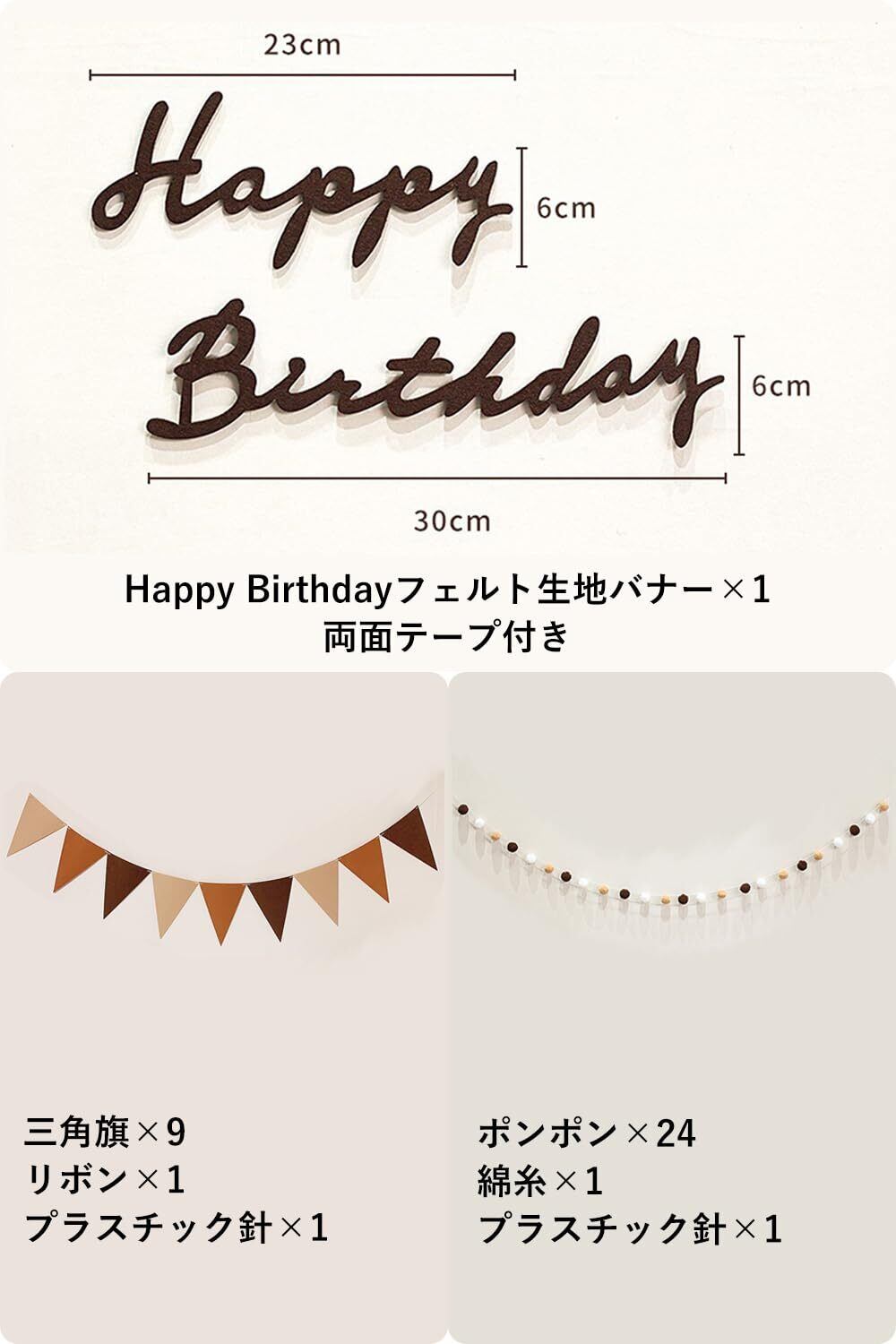●happy birthdayフェルト生地バナー×1、フグボールガーランド×1組、フェルトの三角旗ガーランド×1組。