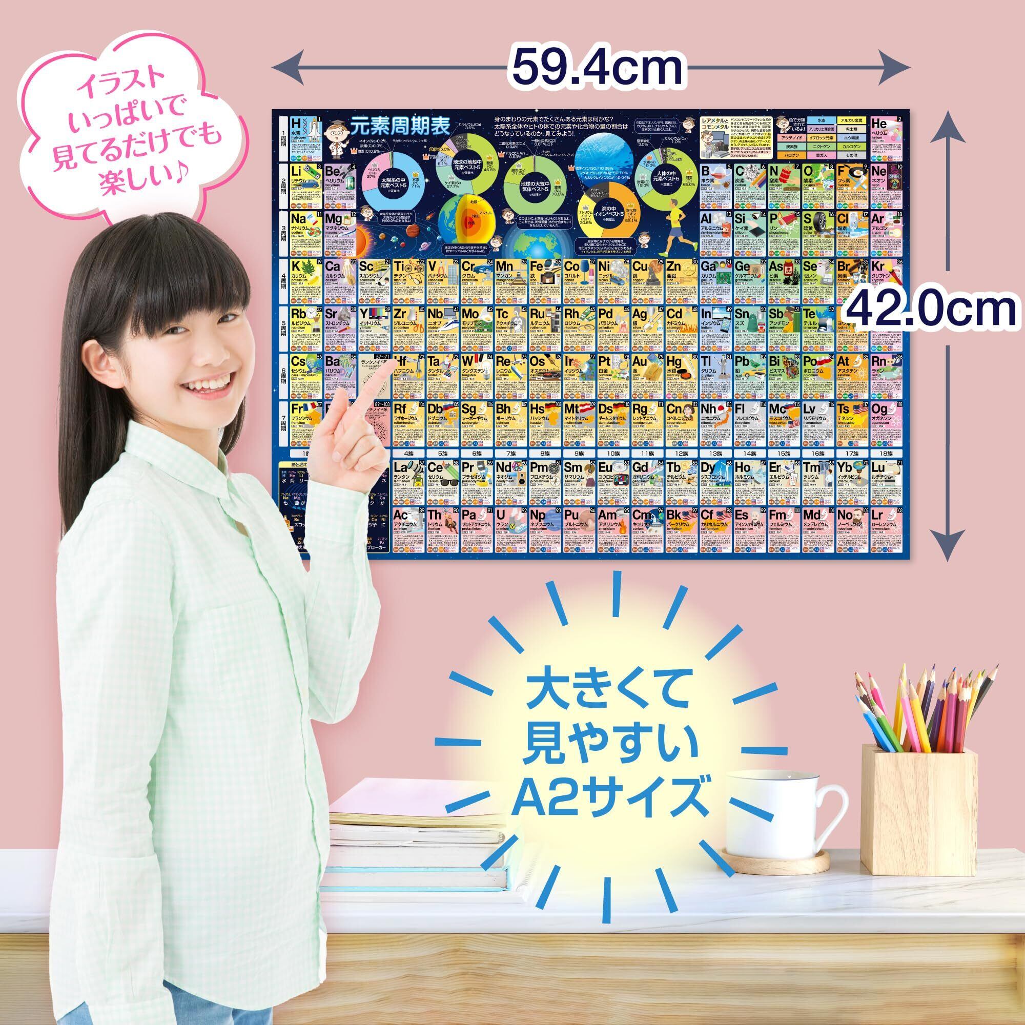 視覚的に理解しやすいデザイン:元素周期表のポスターは、各元素の情報を色鮮やかなイラストやアイコンで表現しています。視覚的に理解しやすく、見ているだけでも楽しみながら学べるデザインになっています。
