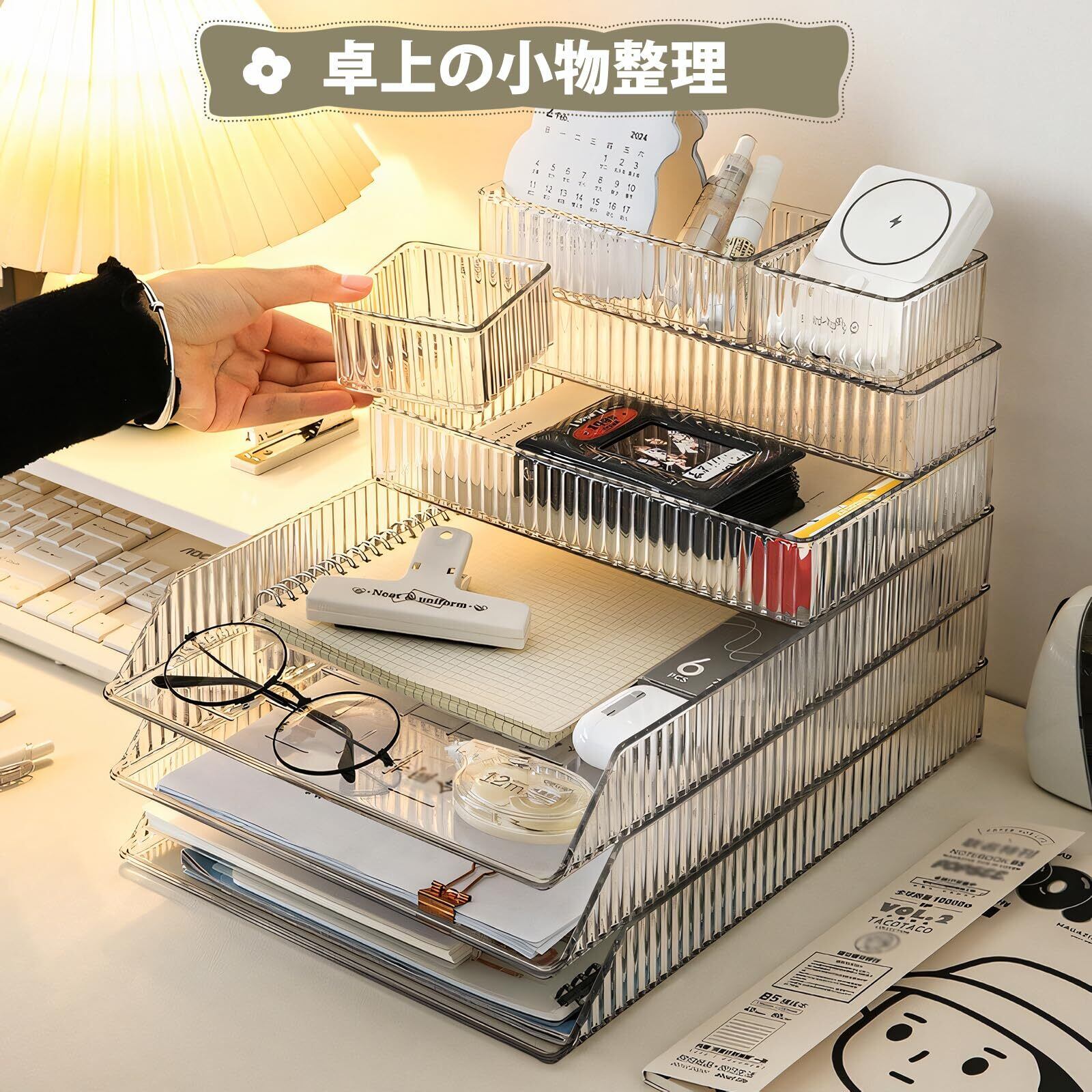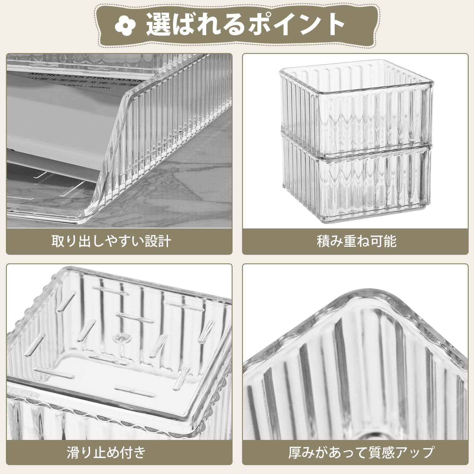 【自由組み合わせ】お部屋やオフィスの卓上や引き出しをスッキリさせられる収納ボックスです。透明を基調としたおしゃれなストライプデザインでお部屋のインテリアに最適です。異なるサイズがあるので、自由に組み合わせて整理可能。