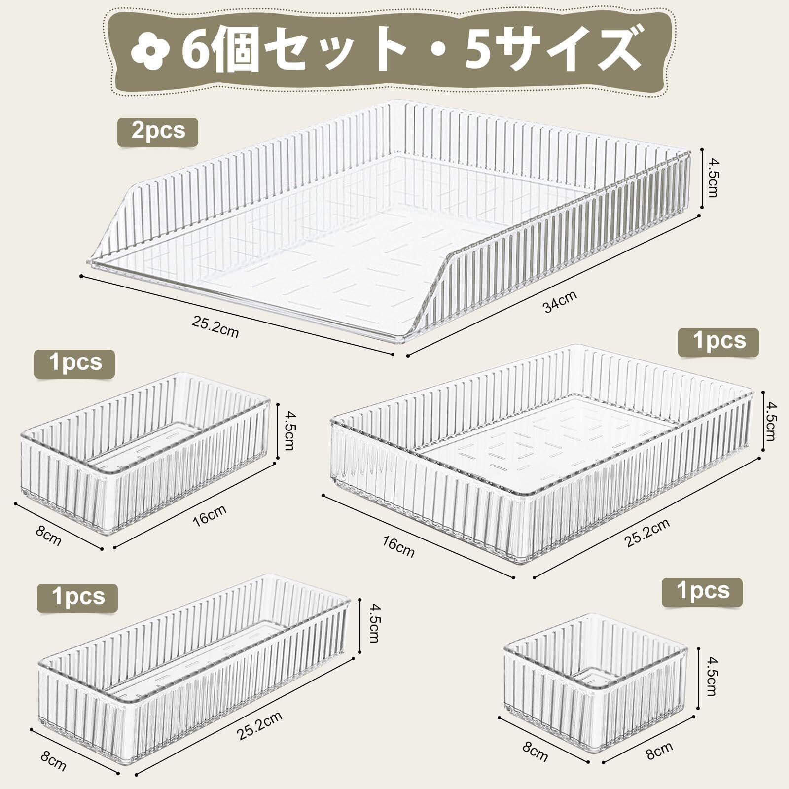 【お得な6個セット収納ボックス】引き出し仕切り トレーセットには5サイズの収納ケースがあります。(XL*2個)34*25.2*4.5㎝、((L*1)25.2*16*4.5㎝、(M*1)25.2*8*4.5㎝、(S*1)16*8*4.5㎝㎝,(XS*1)8*8*4.5㎝。