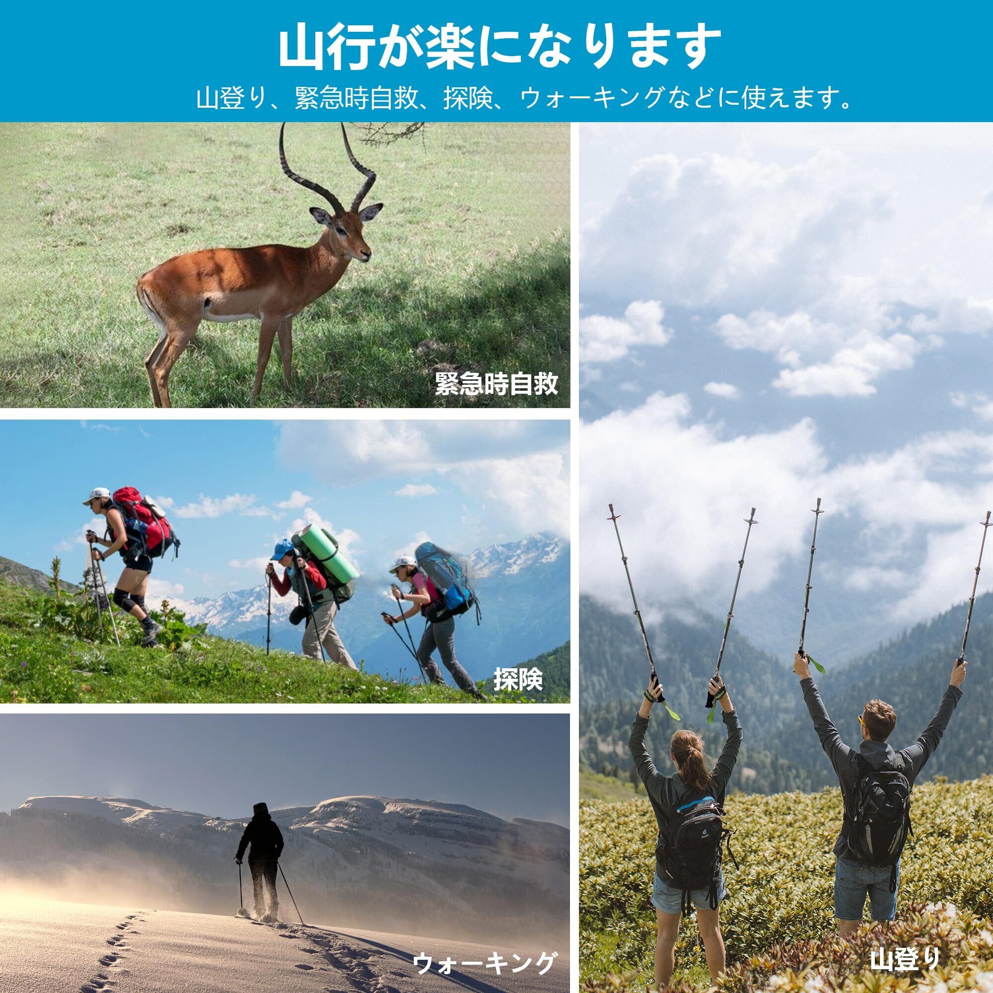 ?【快適な握り心地】登山ポールのハンドルはEVA素材で、手に優しくフィットし、滑りにくいためしっかりと握ることができます。 身体と手に伝わる推進力をダイレクトに感じることができ、力を無駄にすることなく前進できます。 大人から子供まで、厚手の手袋をしていても手にしっかりとフィットします。また、ハンドルを歩行方向に対して前傾させた形状にデザインすることで、ポールの前方への推進力が増し、歩幅が広がります。注意:右手用と左手用は共通で使用できるため、角度を調整して適切なストラップ位置に変更できます。