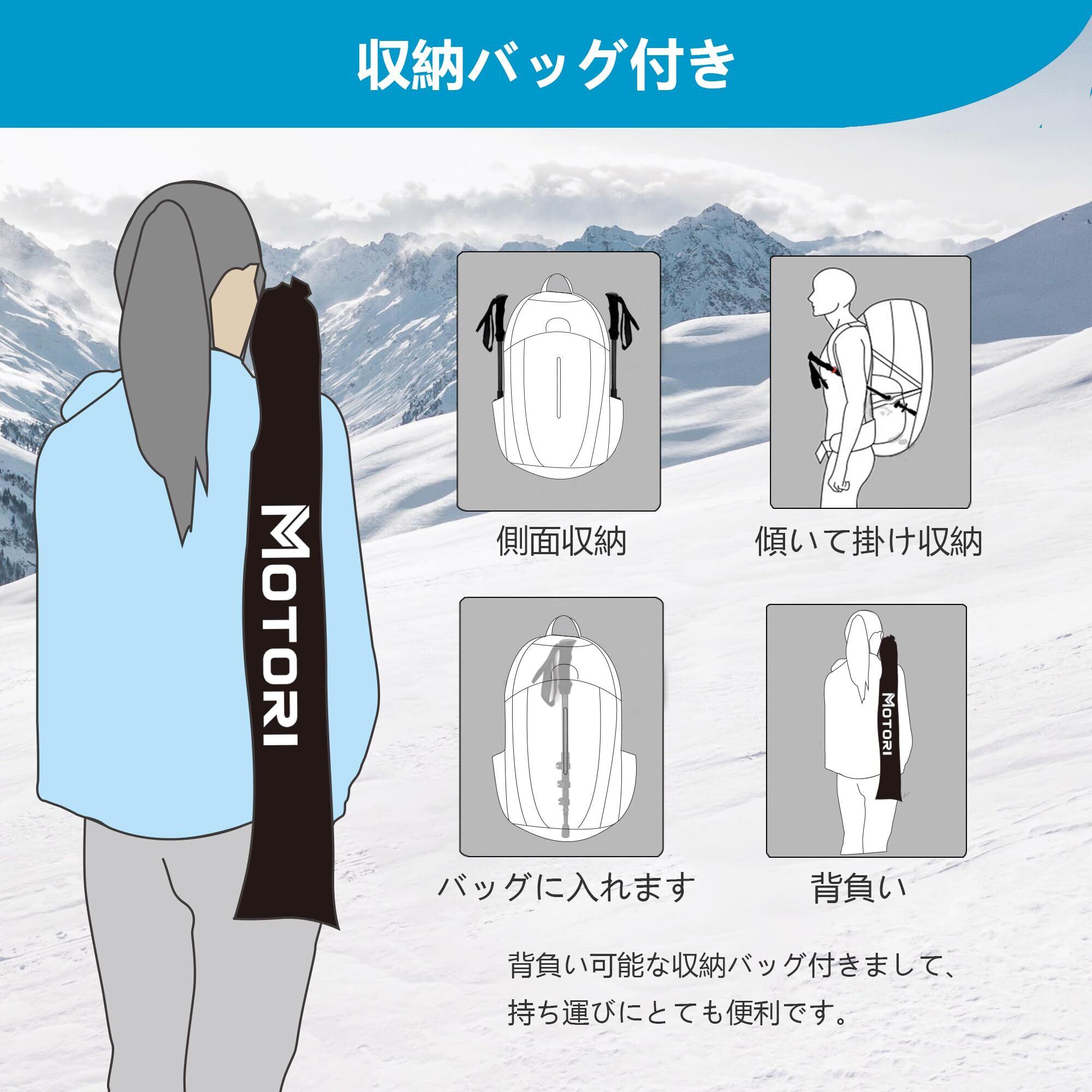 ?【超軽量】軽量を特徴とし、1本の重量はわずか169g。同クラスの中で最軽量でありながら、衝撃吸収性に優れており、手首や腕の負担を軽減します。 長時間の使用でも疲れにくい特徴があります。 【2種類の収納方法】MOTORIのカーボンファイバー登山ポールは、伸縮と分解収納の2通りの収納方法があります。レバーロックを使用することで、最短63cmから最長135cmの3段伸縮ポールとして調整可能です。ただし、ロック部からポールを引き出すことで、最短53cmの収納が可能です。市販の98%の3段伸縮ポールよりも10cm以上短くなります。※1本の登山ポールには2枚のマジックテープが付属しています。個々の使用状況に応じてご利用ください。