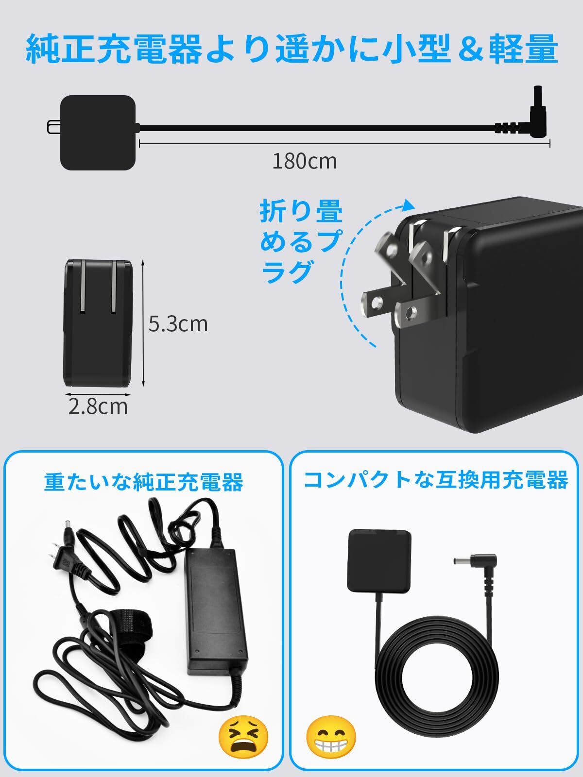 【ケーブルと一体型・小型&軽量・持ち運び便利】この対応レッツノート 充電器はミニサイズのデザインの上、ACプラグも折り畳める設計のため、小さいに収納できて持ち運び便利です。それに充電ケーブルと一体型の設計で別に配線不要、非常に使い勝手が良くて、通勤や通学、出張、旅行などに不可欠なパナソニック交換用ACアダプターです。
