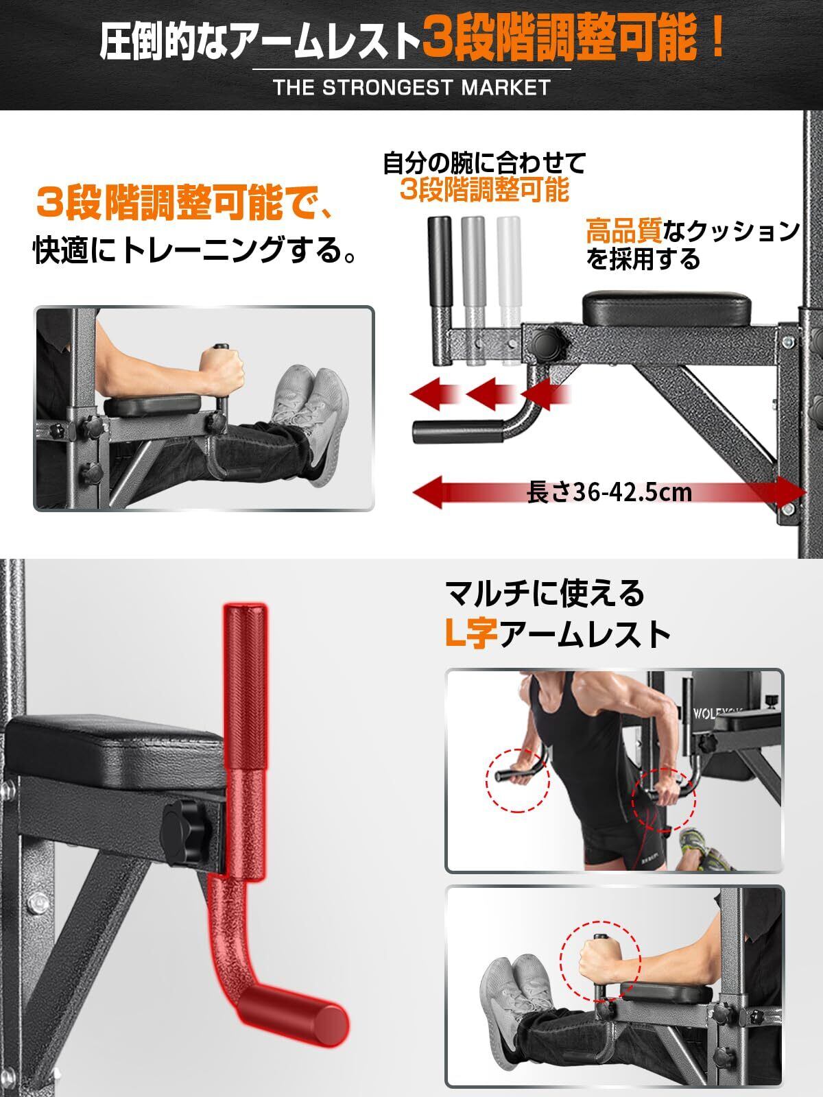 懸垂マシン 【7in1多機能・改良バー・耐荷重200kg】 チンニングスタンド 高度11段調節可能 Wolfyok fitness ぶら下がり健康器 けんすいマシーン 筋トレ器具 背もたれ6段 アームレスト3段 土台π字型 ディップス マルチバー付き 筋トレグッズ マルチジム 懸垂器具 筋力 筋肉 背筋 腹筋 大胸筋 トレーニング器具 初級者/高級者適用 大人/子供/お年寄り適用 家庭/室内用
