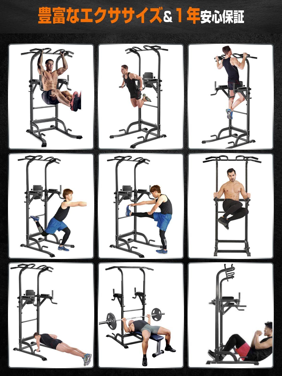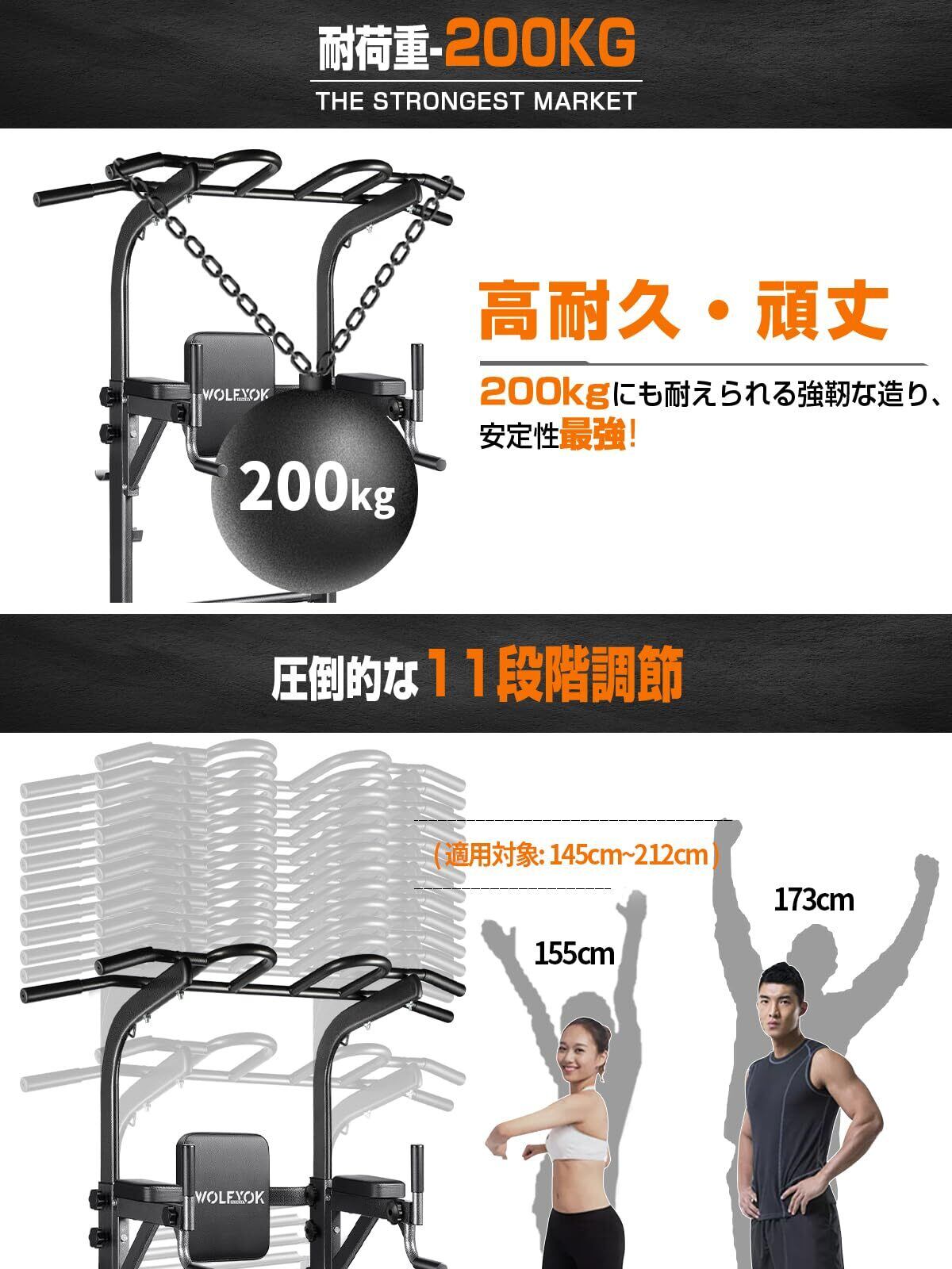 ?【圧倒的耐荷重200KG ・一台あれば十分なチンニングスタンド】Wolfyok fitness ぶら下がり健康器は200kgまでの耐荷重、安定して耐久性があり、より安心して使用できます。??また、懸垂マシン下部の補強バーで固定、しっかりサポートすることでより安定します。?【一台で鍛え方いろいろ!】多機能懸垂マシンで、ディップス、レッグレイズ、プッシュアップ、ストレッチなど総合的なトレーニングができます。腹直筋 、腸腰筋、上腕三頭筋、大胸筋、三角筋大胸筋、三角筋、僧帽筋、腹筋、広背筋、僧帽筋 、大円筋、上腕二頭筋などの様々な運動がこれ一つで行えます。