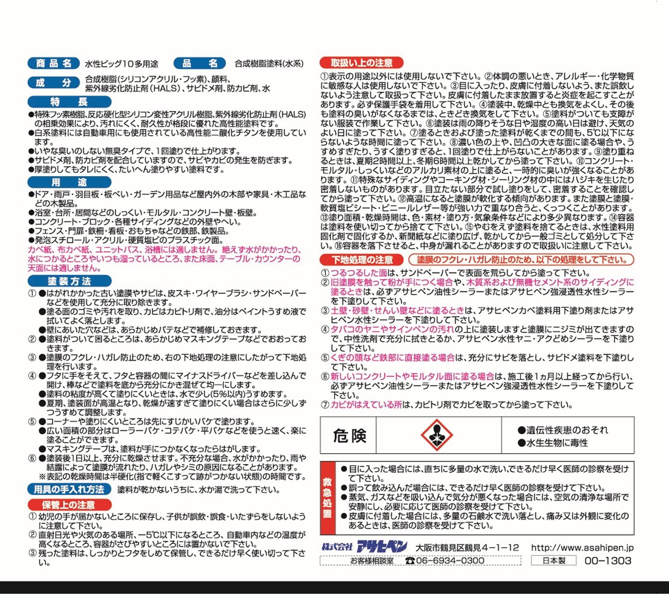 下処理方法:■土壁・砂壁・せんい壁などに塗るときは、アサヒペンカベ塗料用下塗り剤か水性シーラーで下塗りしてください。 ■旧塗膜を触って粉が手につく場合や、木質系及び無機セメント系のサイディング、コンクリートやモルタル面に塗るときは油性シーラーを下塗りしてください。