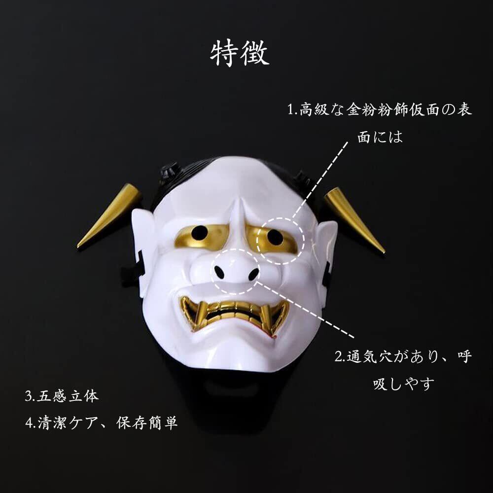 4.特徴:立体的な金色の角と迫力あるリアルで怖い表情のオニお面(はんにゃ面)。