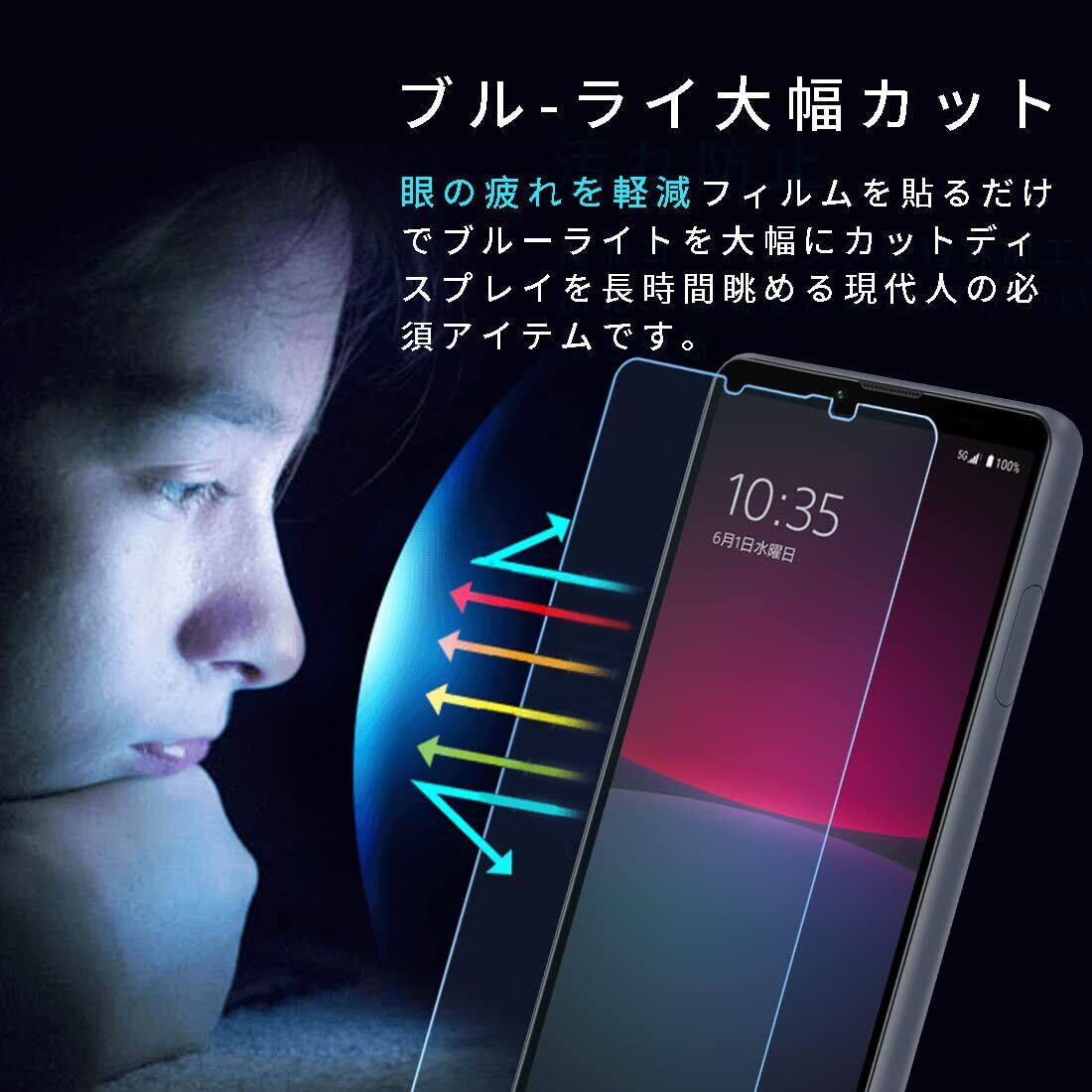 ?対応機種:Xperia 10 IV / Xperia 10 III / Xperia 10 III Lite SO-52C SOG07 SOG04 SO-52B 専用です。【ブルーライトの悪影響】ブルーライトとは、波長が400?500ナノメートルの光のことです。 ブルーライトは、短波と高エネルギーの可視光の一種であり、レンズを直接透過して網膜に到達できます。 スマートフォンの時代では、人々はより多くの時間を電話の画面を見つめて過ごします。 ただし、画面が多くのブルーライトを生成し、人々の目に害を与え、近視の度合いを深め、視覚疲労を引き起こし、睡眠障害があるかもしれません。