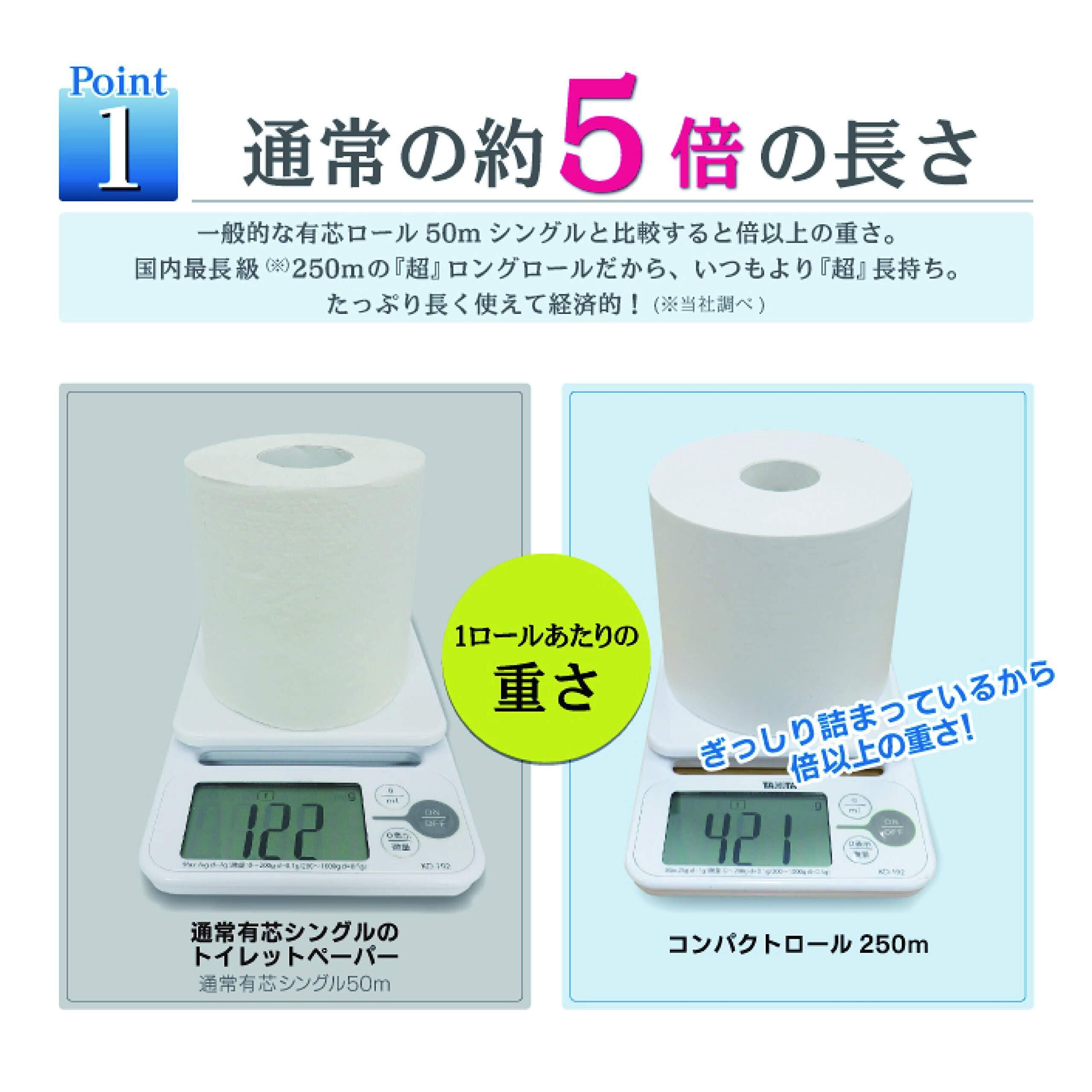 再生紙100%トイレットペーパー 業務用 5倍の長さの250m 交換回数が少なくてOK