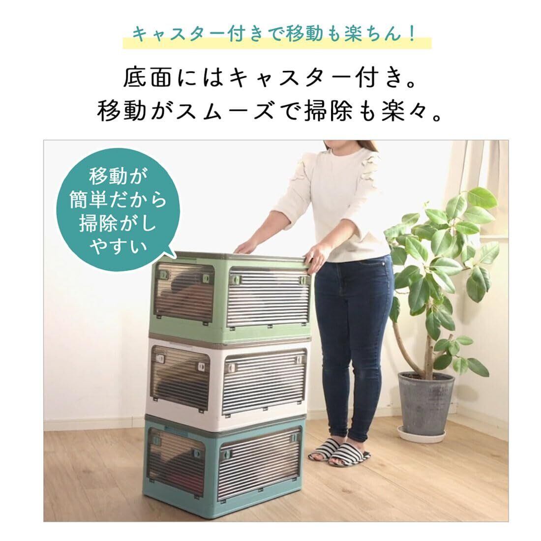 【積み重ねても移動はラクラク】底面にはキャスターが付いているので、重さがあっても移動がスムーズ。収納スペースの掃除をする際も移動させて楽ちん。 底面にはちゃんと補強材を使用しているので耐久性も抜群。積み重ねる時はキャスター部分を引っかけるくぼみがあるのでしっかり固定できて安心。