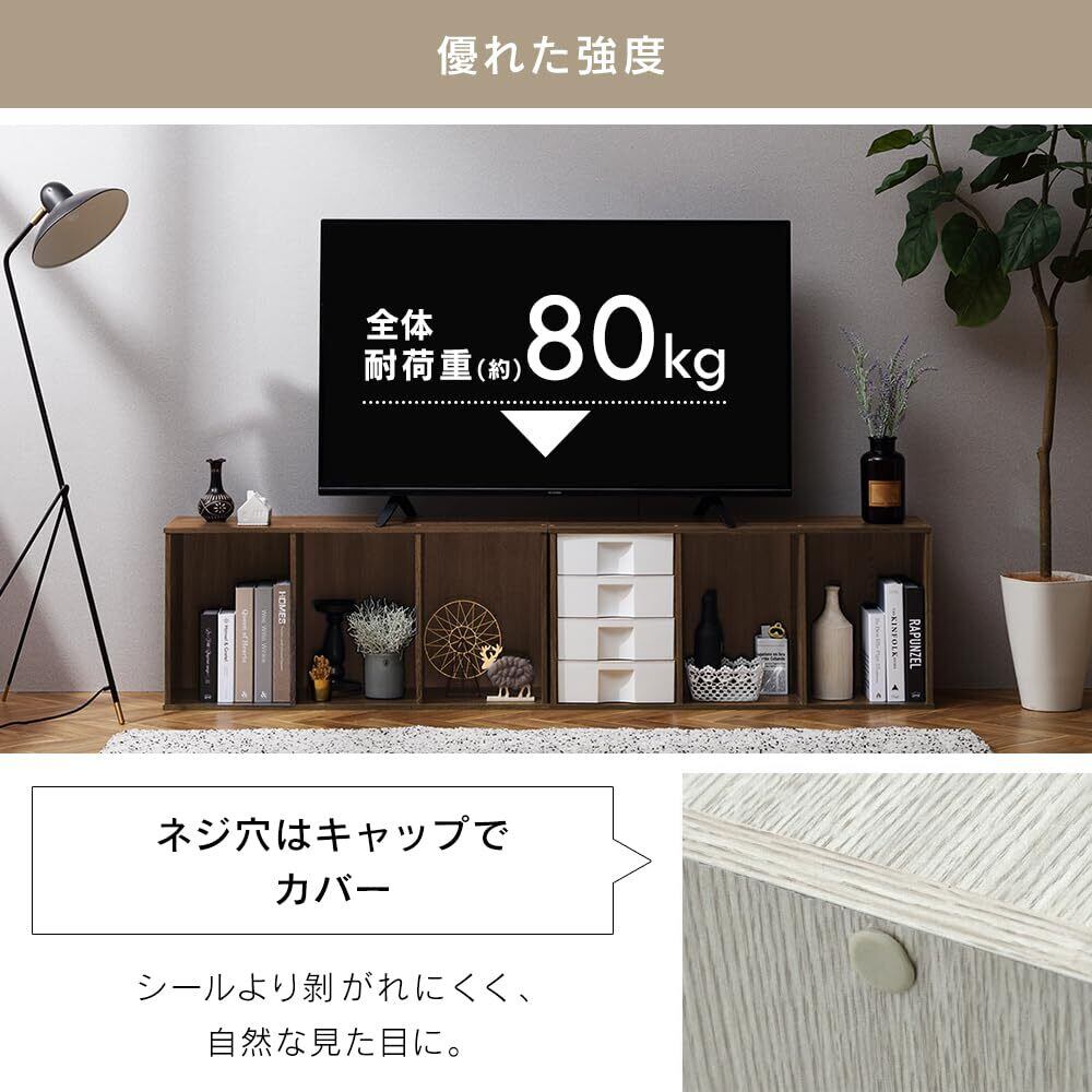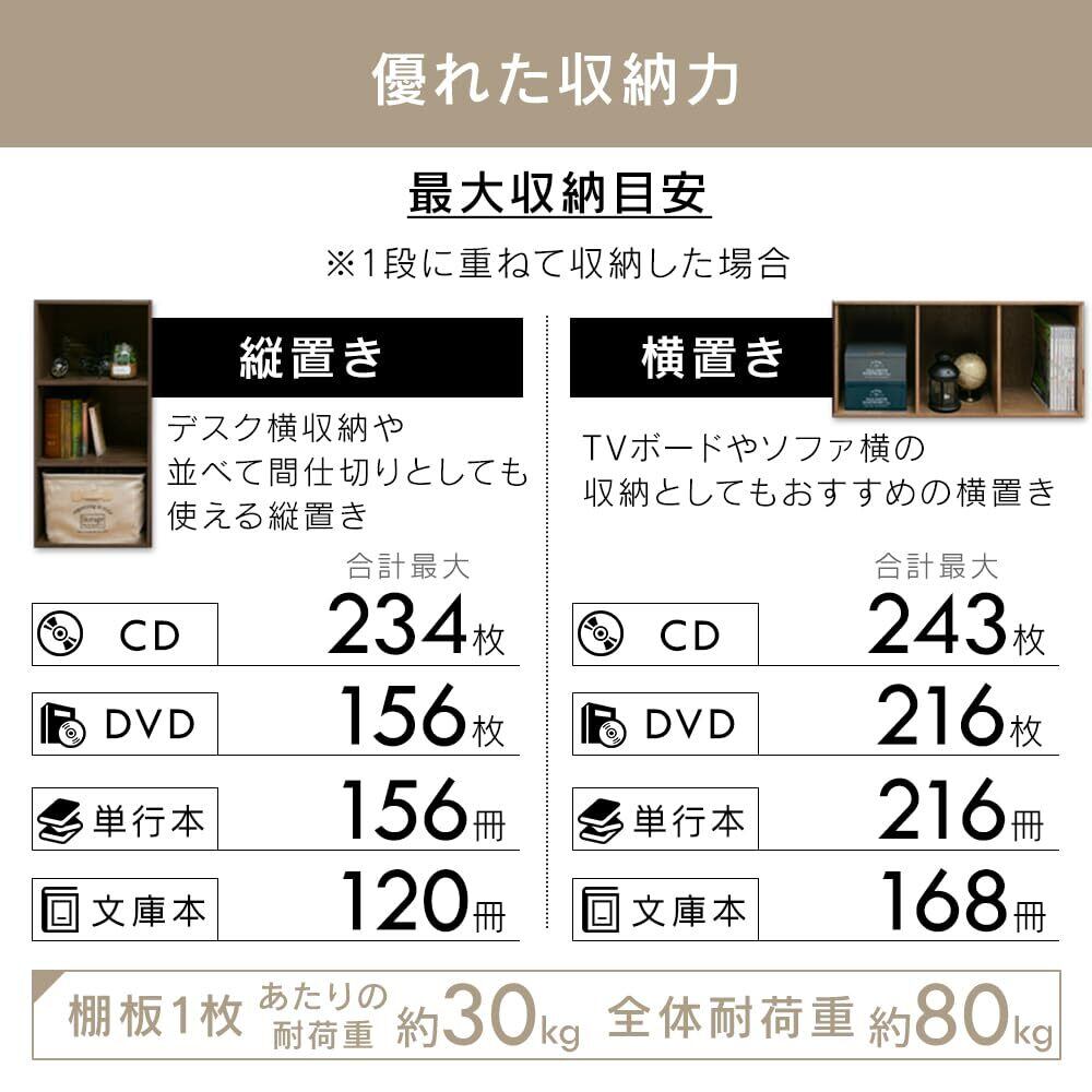 各棚板にはパーティクルボードの1枚板を使用しており、しっかりとした造りが特徴です。全体の耐荷重は約80kgと高く、毎日使う収納家具として、耐久性と安定感に優れています。