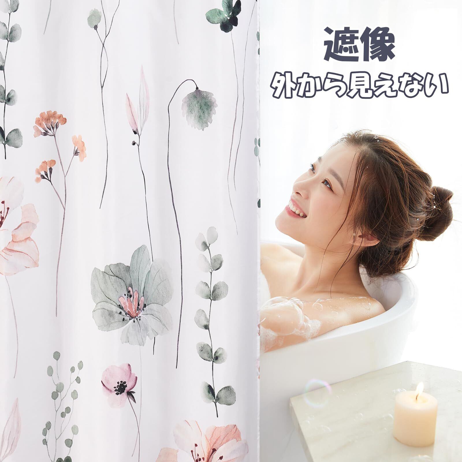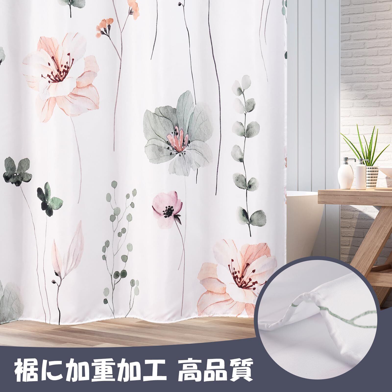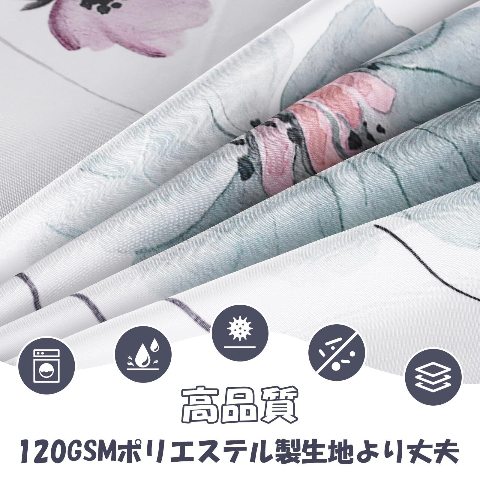 優れた品質 - 当社のシャワーカーテンは100%ポリエステル製でにおい無し、柔らかくて手触りよく、耐久性があり軽量な素材です。 重みのある裾が付いており、カーテンを所定の位置に保ち、吹き飛ばすのも防ぎ、フィット感がいいです。美しい花柄で、自然に近い気があります。