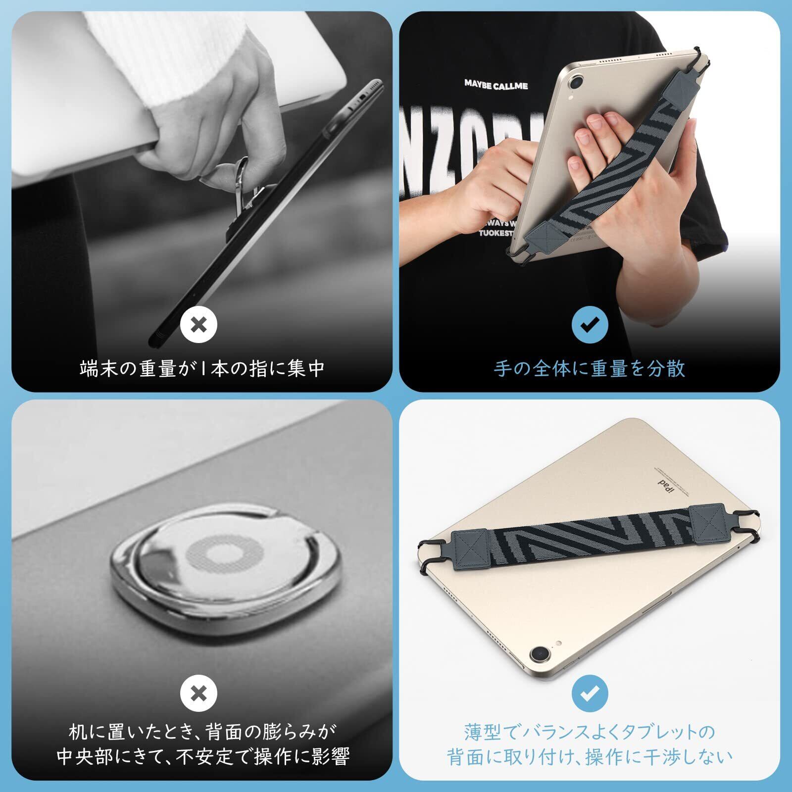 「片手持ち便利アイテム」 長時間タブレットを持っていると重く感じて手が疲れますが、このアイテムがあれば、タブレットの重量を手の全体、更に手首まで分散でき、より快適にタブレットを使えます。使用中手の疲れを分散でき、うっかりして落下するリスクも防げます。
