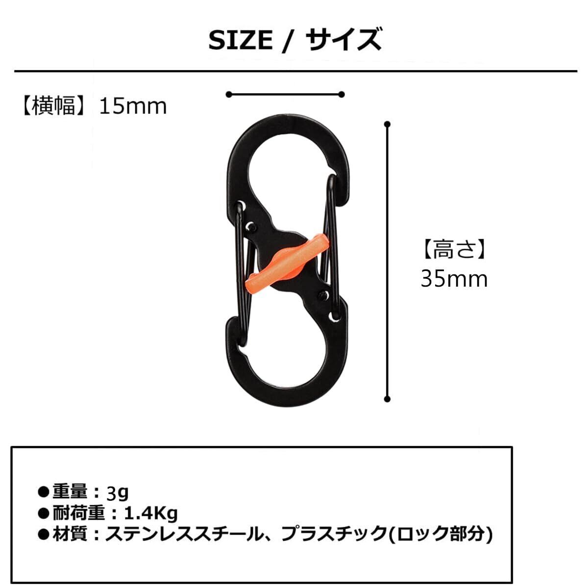 【サイズ】:H35×W15×D1.5mm 重量:3g 材質:3Cr13ステンレス 耐荷重:1.4kg ※注意点:クライミング用のカラビナとして使用することは危険ですのでお止め下さい。