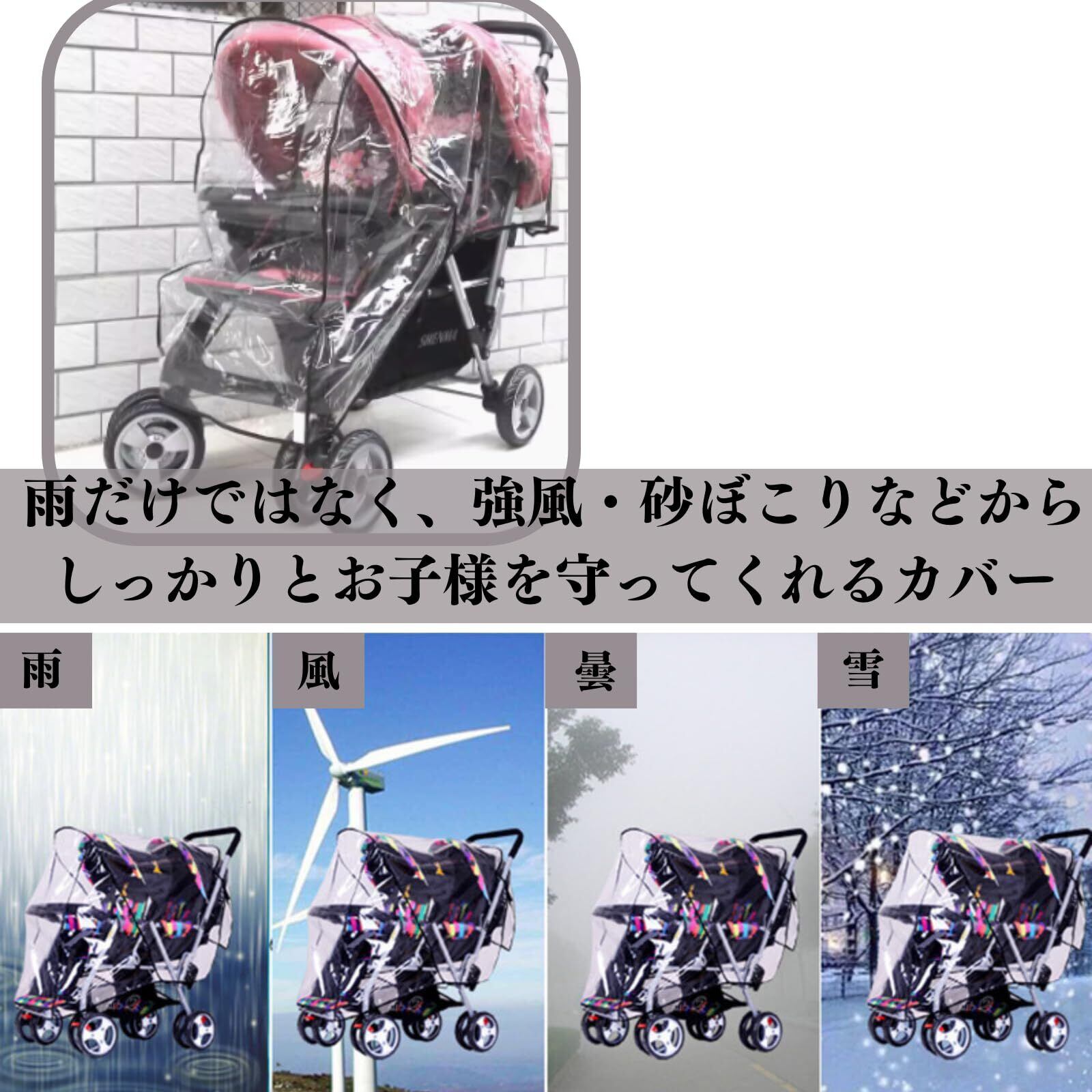 縦型の2人乗りベビーカー専用レインカバーです。しっかりとした防水素材で作られており、突然の雨や強風、砂埃などからお子様をしっかりと保護します。
