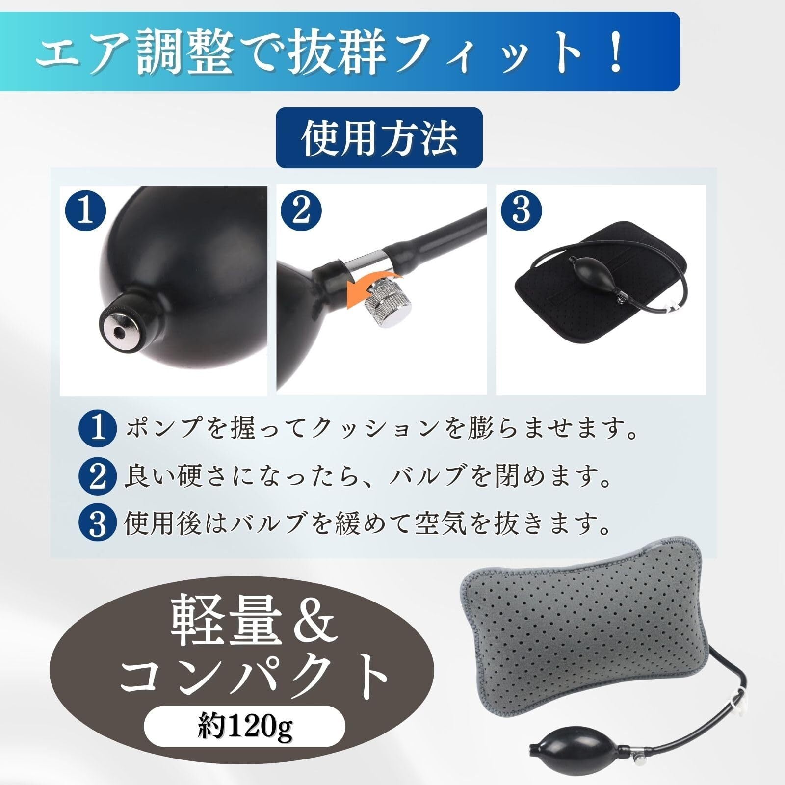 エアー注入式のランバーサポートです。この腰枕は腰をしっかりサポートし、背中の痛みや不快感を軽減します。このエアークッションは通気性のある素材を使用し、快適に長時間使えます。オフィスや車、旅行先、キャンプ場でも使用でき、エアー調整により硬さをお好みに調節できます。空気の入れすぎにはご注意ください。