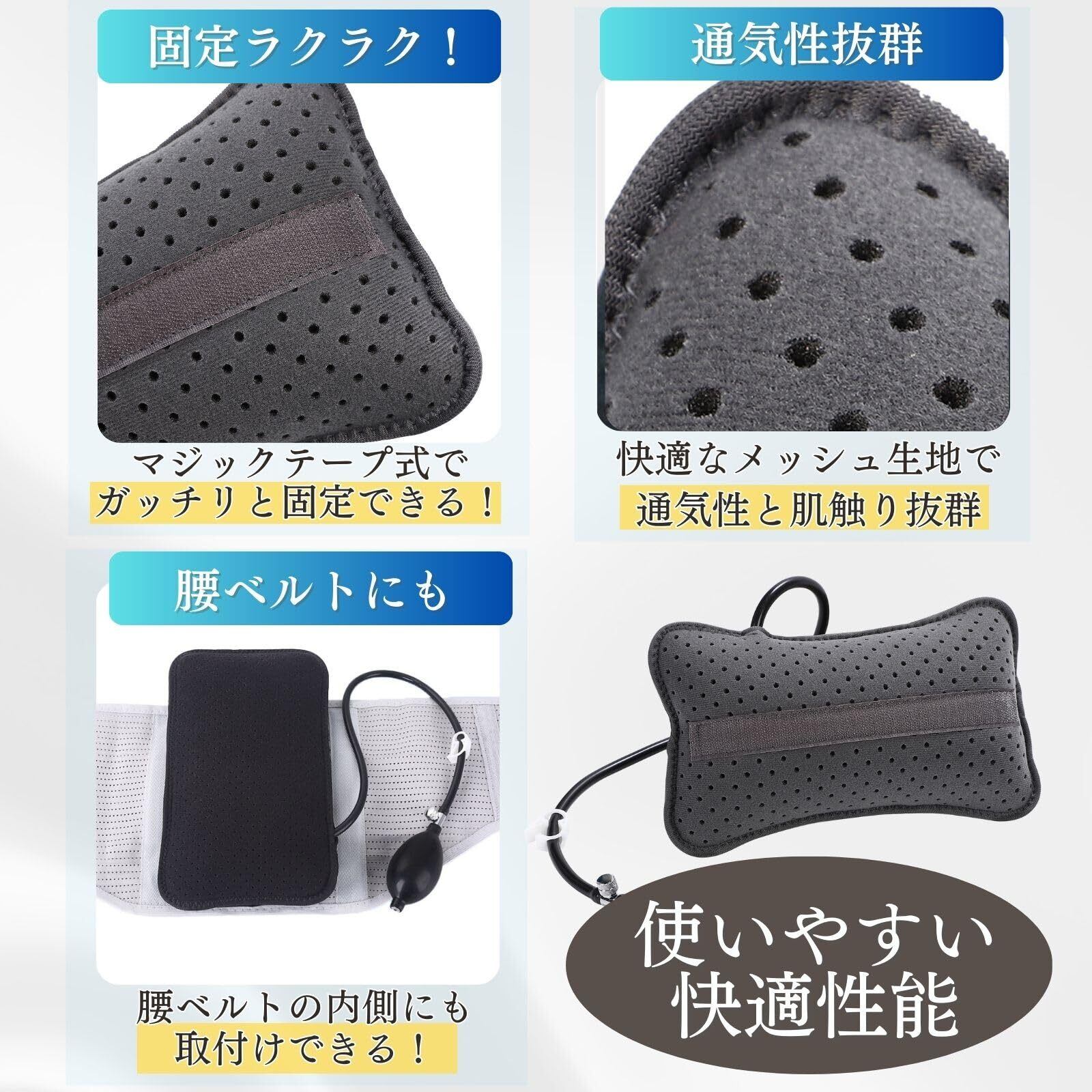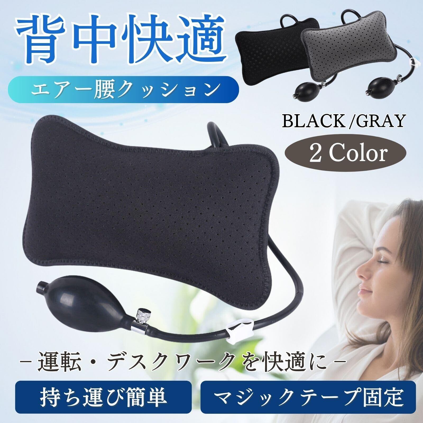 エアー注入式のランバーサポートです。この腰枕は腰をしっかりサポートし、背中の痛みや不快感を軽減します。このエアークッションは通気性のある素材を使用し、快適に長時間使えます。オフィスや車、旅行先、キャンプ場でも使用でき、エアー調整により硬さをお好みに調節できます。空気の入れすぎにはご注意ください。 デスクワークや長時間の運転で腰に負担を感じる方におすすめです。腰のS字カーブをサポートし、腰痛ベルトや腰サポーターの内側にも活用できます。腰痛対策だけでなく、姿勢矯正や姿勢サポートにも効果的です。ゲームをする方やゲーミングチェアにも最適で、新幹線、飛行機での長時間移動にも便利です。猫背に悩む方にもおすすめの腰枕で、車のレカロシートや椅子、ソファに使用しても快適です。 この腰クッションはコンパクトで持ち運びに便利です。空気を抜いて小さくまとめることができるので、出張や旅行にもピッタリ。オフィス、キャンプ、車内などどこでも簡単に快適なサポートが得られます。バルーンのように膨らませるだけで準備完了です。 使い方はとても簡単です。空気を入れて膨らませ、背もたれやシートに挟むだけ。硬さは空気圧で調節できるので、自分にぴったりのフィット感が見つけられます。マジックテープ付きで腰ベルトへの取り付けもスムーズです。ドライブ中の腰痛を軽減し、車腰痛クッションとしても活用いただけます。 クッション本体のサイズは約26×17cm、重さは約120gとコンパクトで軽量ながらしっかりとしたサポート力があります。ブラックとグレーの2色からお選びいただけます。ピローとしても使用可能で、車用やオフィスチェアでの使用にもおすすめです。腰痛やぎっくり腰の方にも安心してお使いいただける腰枕です。
