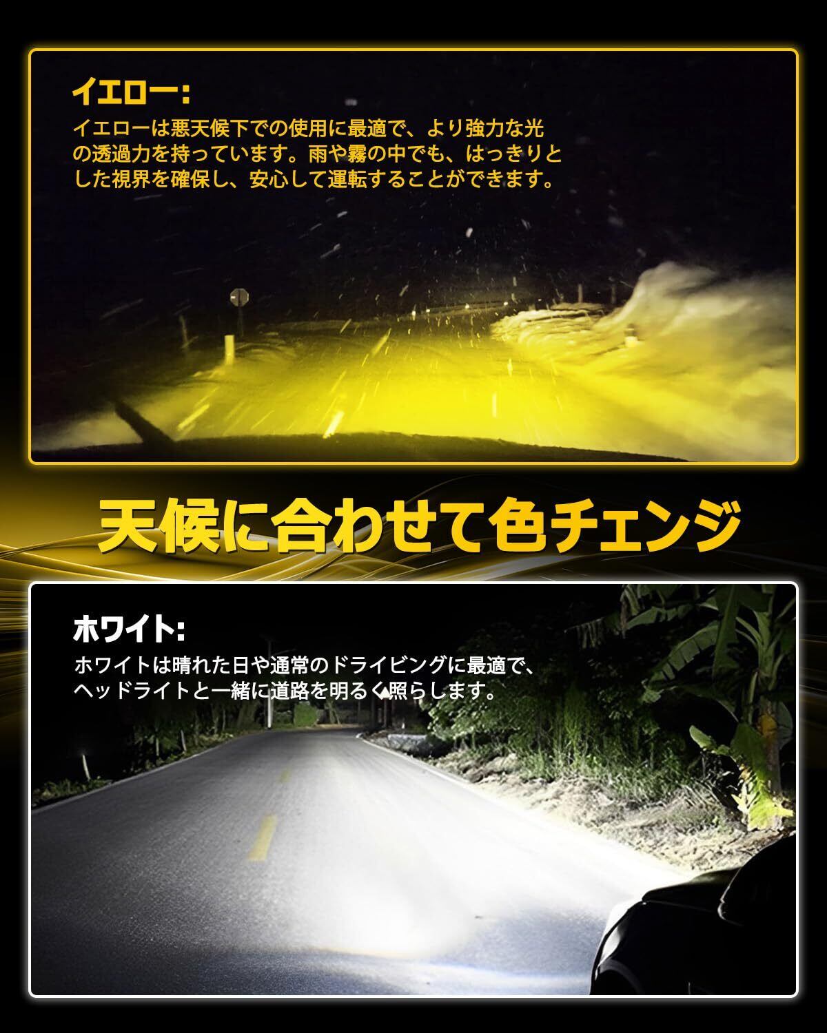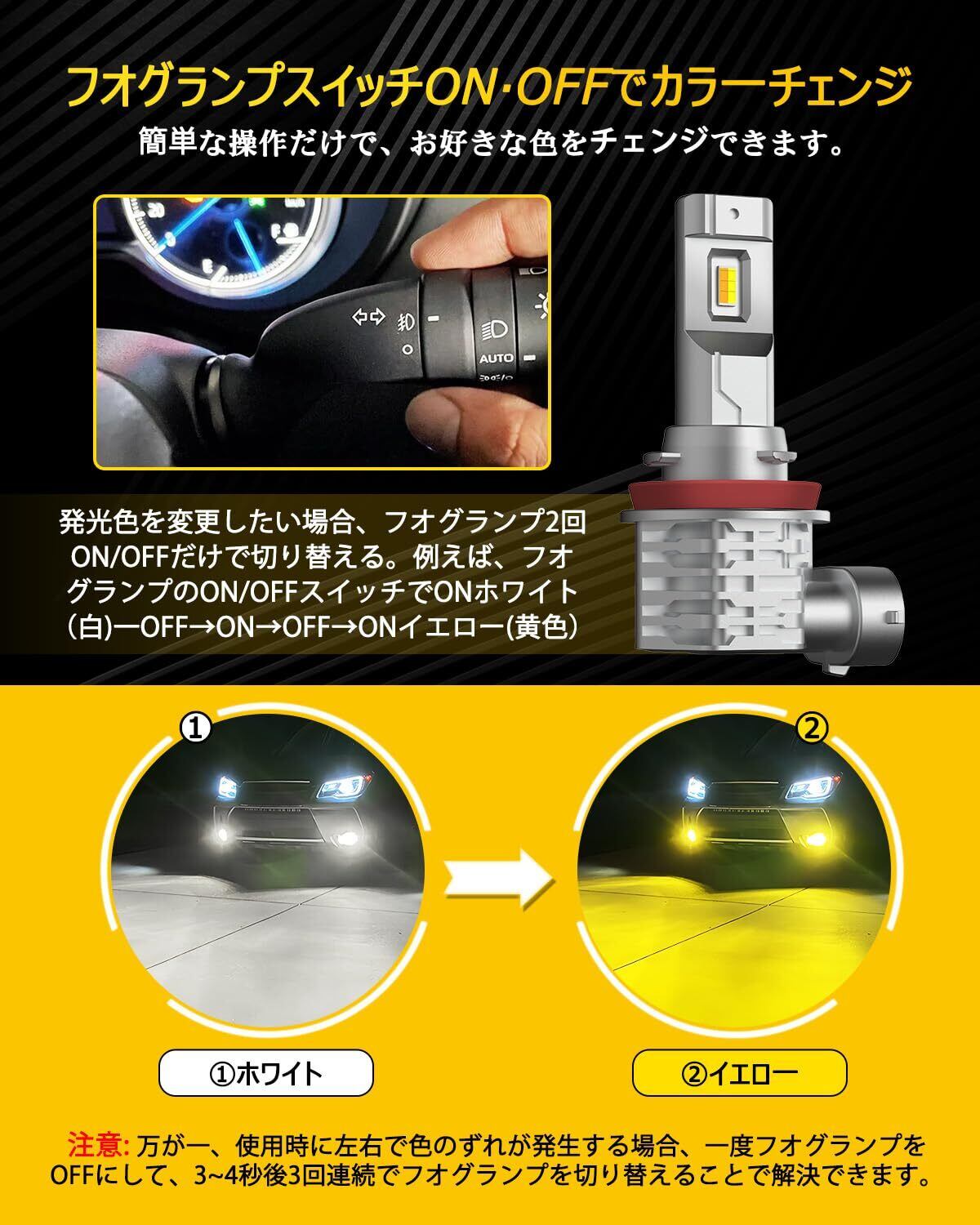 【2色切り替&明るい】AUXITOから 2色切り替え H8 H11 H16 H9 LED フォグランプが登場!ワイドに広がる光が路面を明るく照らし路面の視認性が抜群です。AUXITO H8 LED フォグ は簡単操作でカラーチェンジ可能で、天候や路面のコンディションに合わせてカラーを切り替えることで快適なドライブをサポートします。イエローは悪天候下での使用に最適で、より強力な光の透過力を持っています。雨や霧の中でも、はっきりとした視界を確保し、安心して運転することができます。 ホワイトは晴れた日や通常のドライビングに最適で、ヘッドライトと一緒に道路を明るく照らします。
