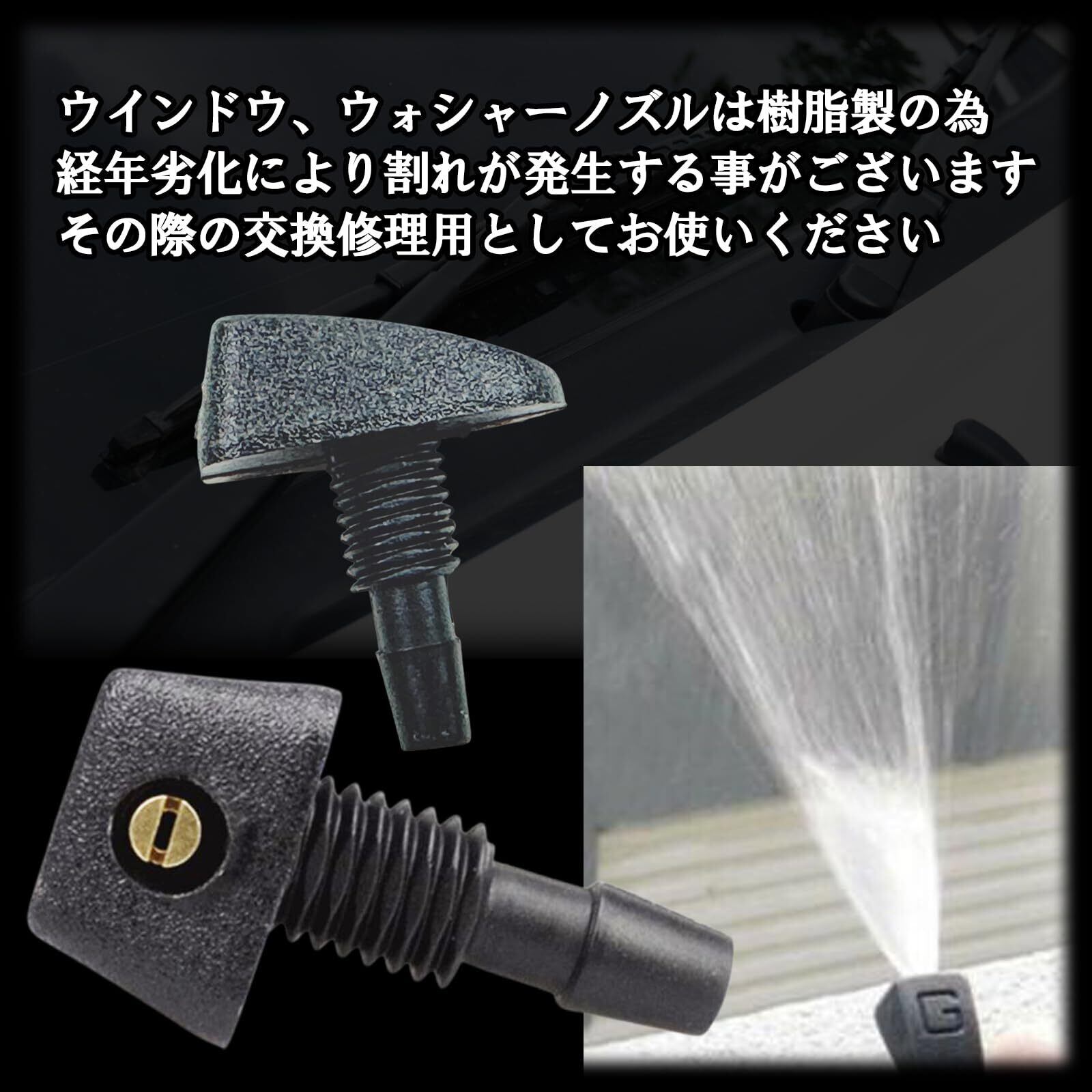 ウインドウ、ウォシャーノズルは樹脂製の為、経年劣化により割れが発生することがございます。その際の交換修理用としてお使いくださいませ。