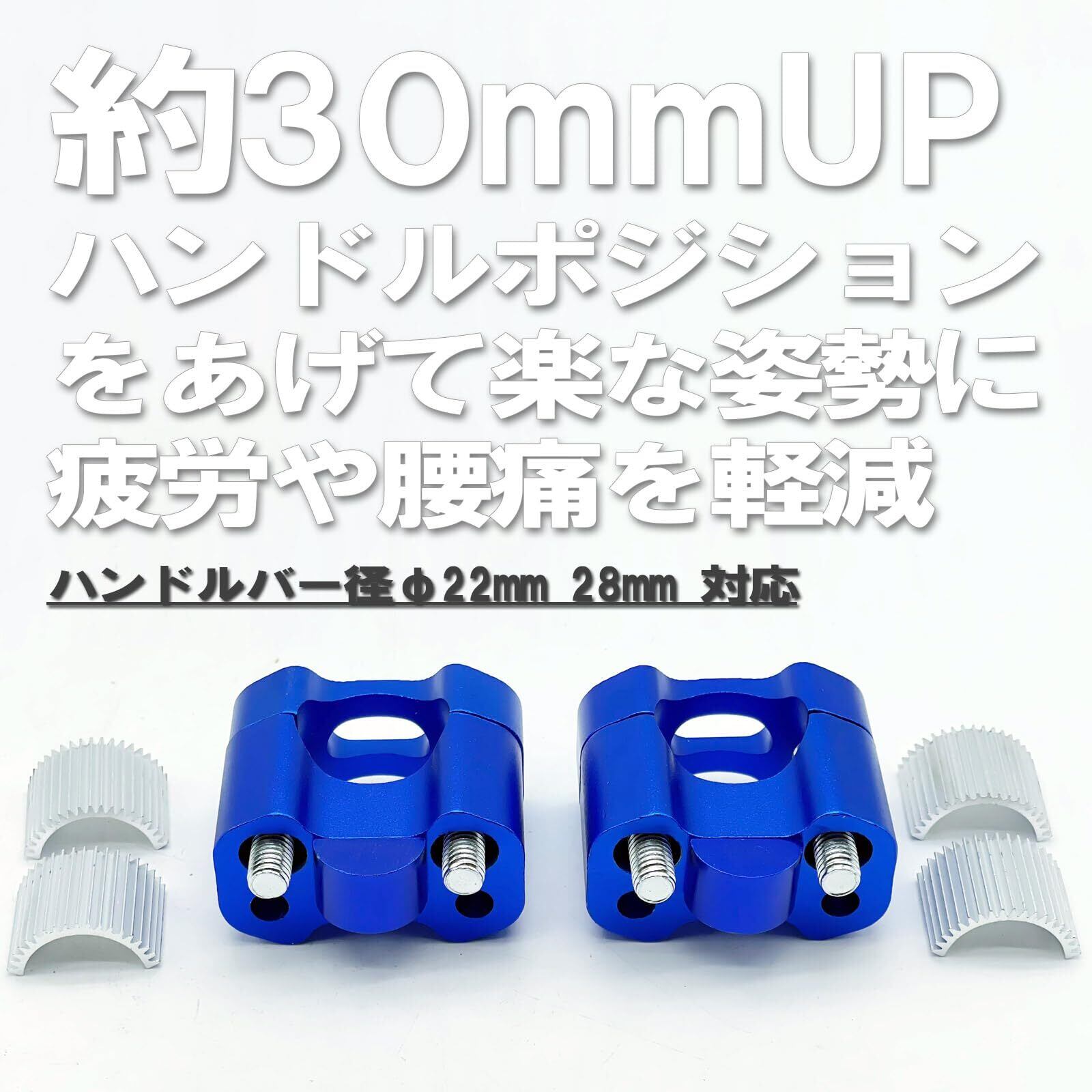 純正のハンドルクランプに取り付けるだけでハンドルポジションが約3cmアップ。カラーはブルーになります。※取付ピッチとハンドルパイプ径をご確認ください。