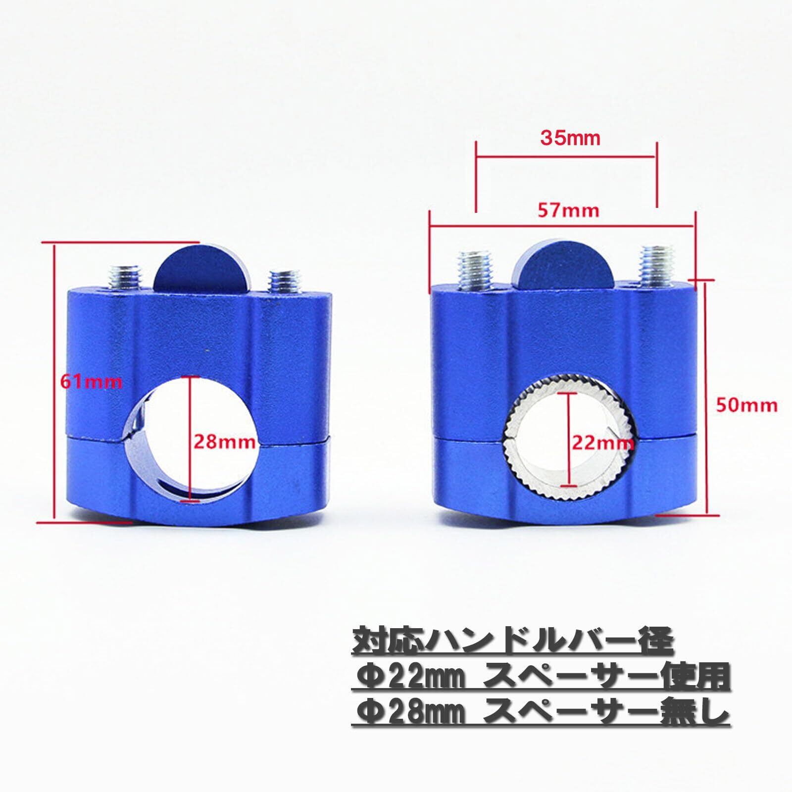 ハンドル径は22mm(22.2mm)と28mm(28.6mm)の両方mのハンドルに適合し、取付ボルトピッチが32mmから38mmの車両に取り付け可能なので様々な車種でご使用いただけます。