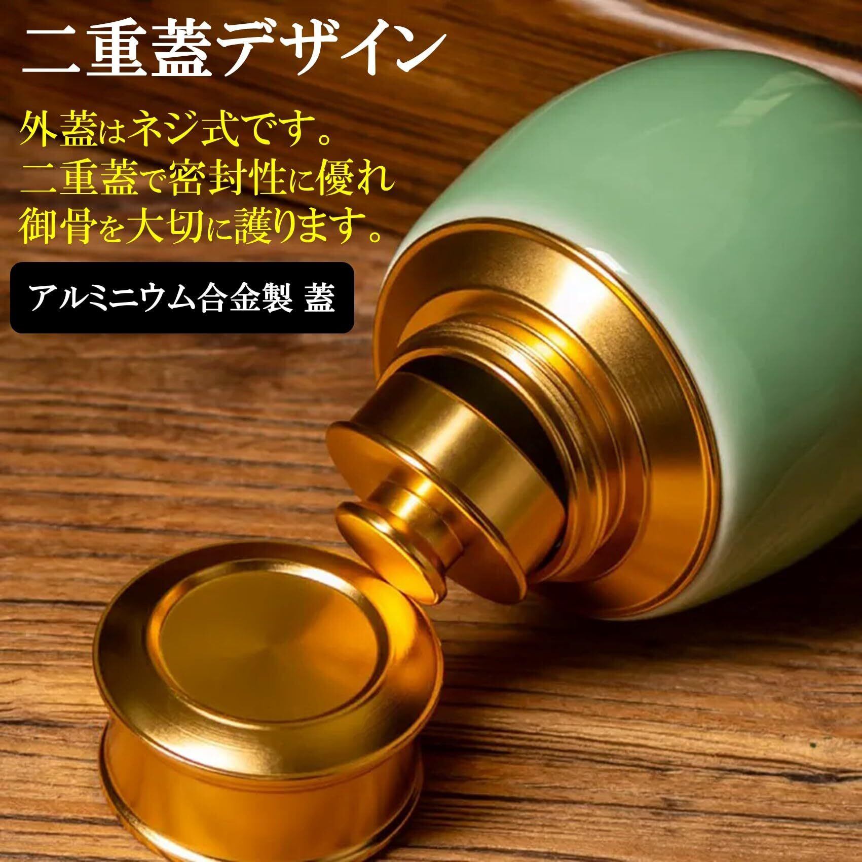 気品高い黄金色の蓋は、頑丈なアルミニウム合金素材を使用し二重構造設計となっております。外蓋はネジ式で密封性に優れ御骨を大切に護ります。