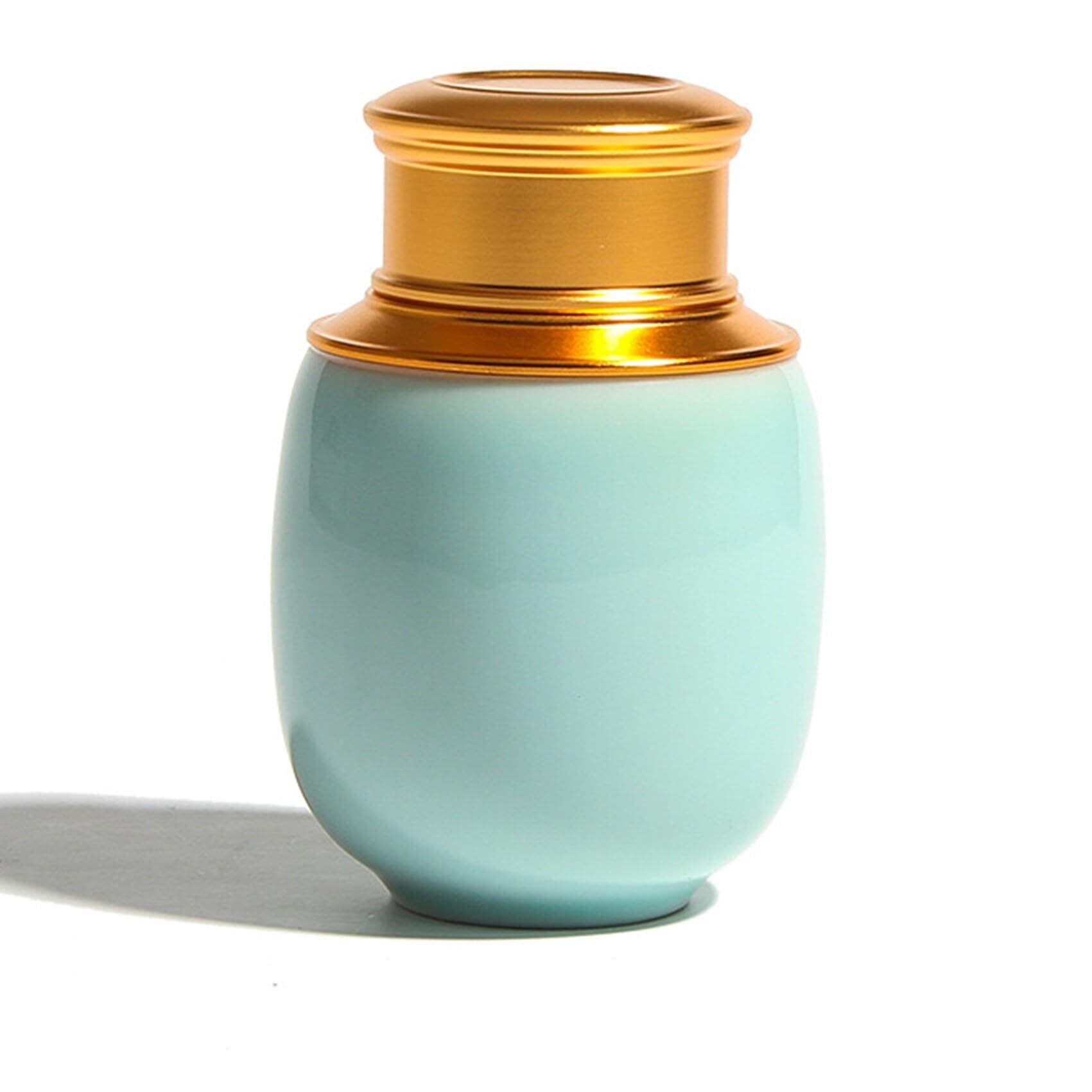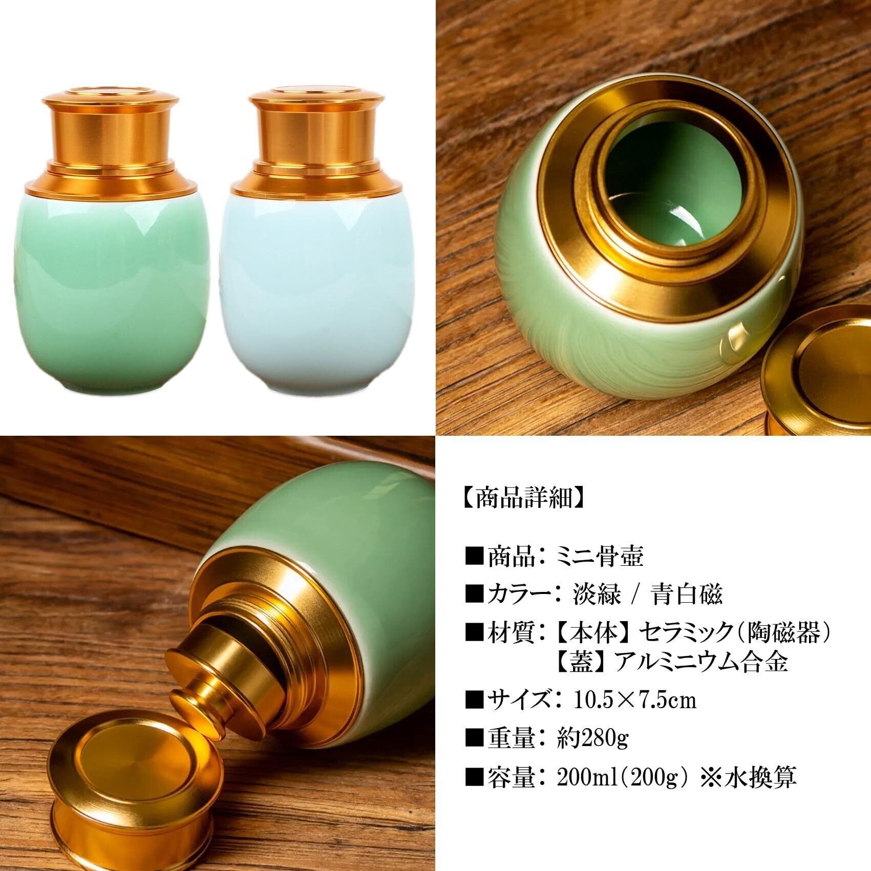 商品詳細: ミニ骨壺 【カラー】 淡緑 / 青白磁 【材質】 本体:セラミック(陶磁器)・蓋: アルミニウム合金 【サイズ】10.5×7.5cm 【重量】 約280g 【容量】 200ml(200g)水換算 ※モニターの環境等により、色の見え方に若干差が生じる場合がございます。予めご了承ください。