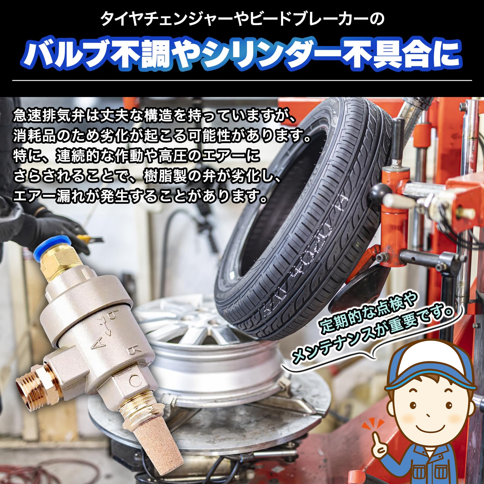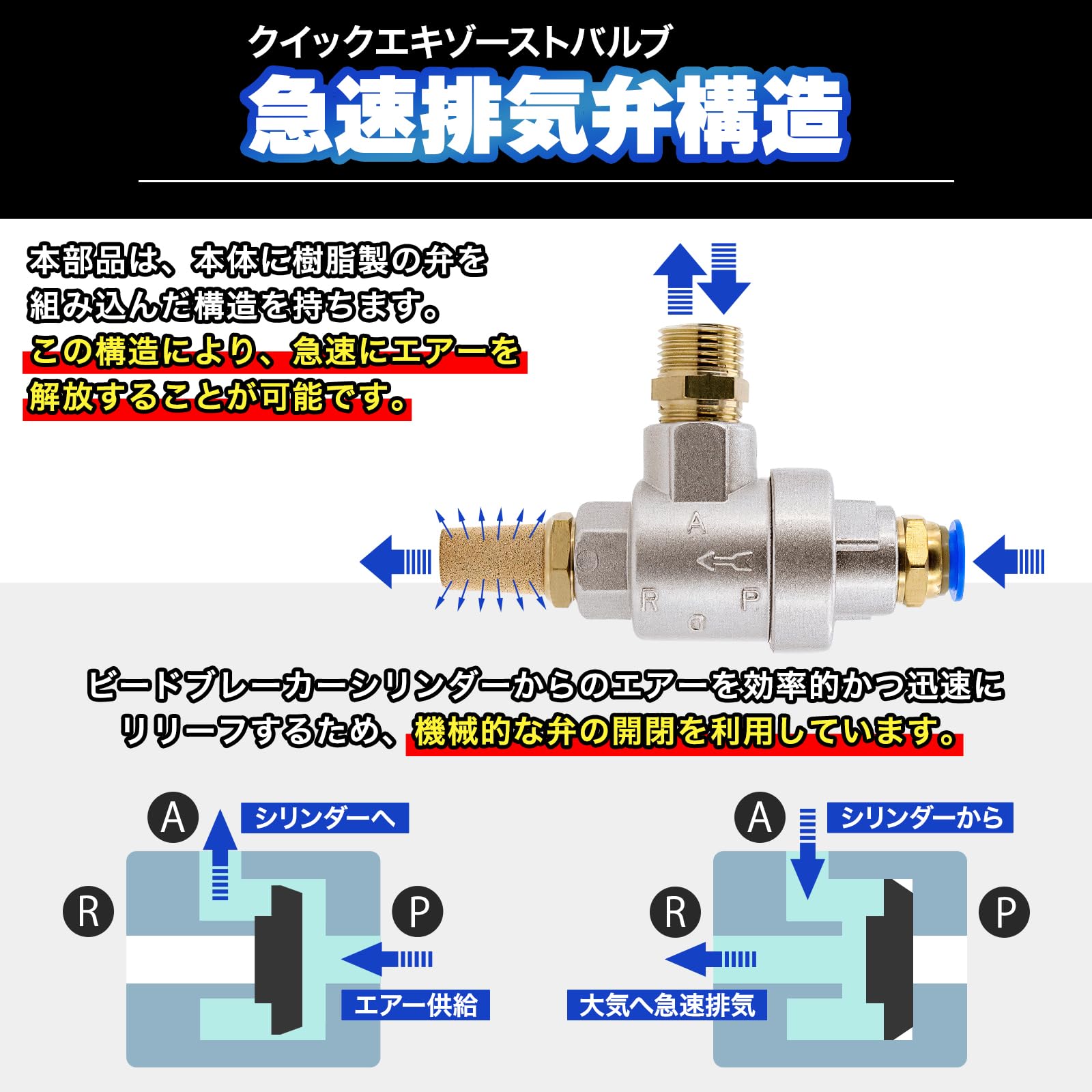 ?本部品は、本体に樹脂製の弁を組み込んだ構造を持ちます。この構造により、急速にエアーを解放することが可能です。ビードブレーカシリンダーからのエアーを効率的かつ迅速にリリーフするため、機械的な弁の開閉を利用しています。