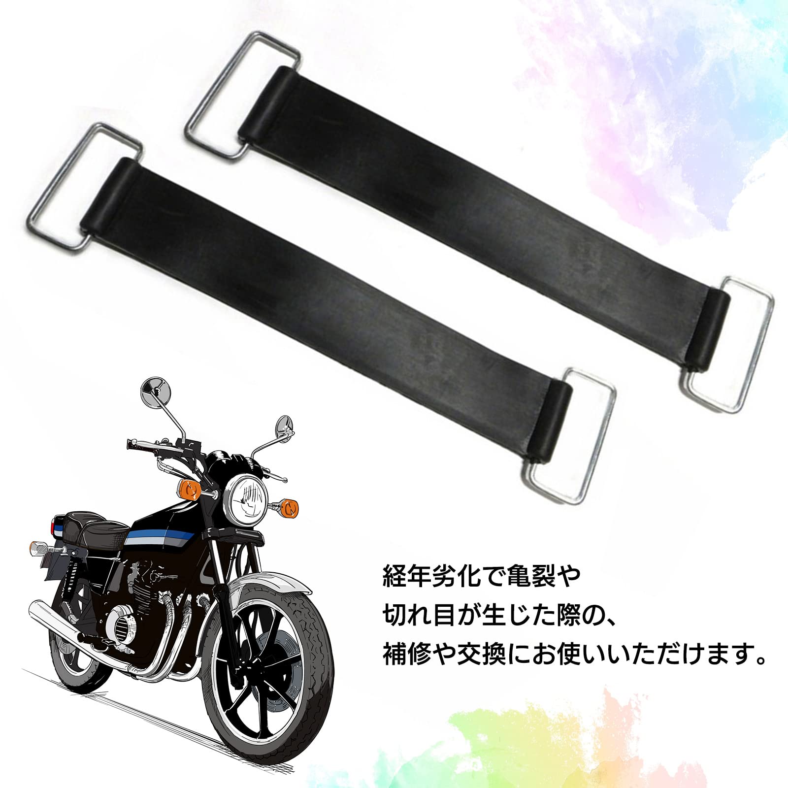 バイク用バッテリーを固定するバンドは、経年劣化で亀裂や切れ目が生じるため、補修や交換が必要なパーツです。取り付けが簡単なデザインで、初心者でも扱いやすく、ゴムの伸縮性が高いため、多くのバッテリーサイズにフィットします。柔軟性があり、耐久性にも優れているため、長期間にわたり安心してご使用いただけます。様々な用途で活用できる実用的なアイテムです。