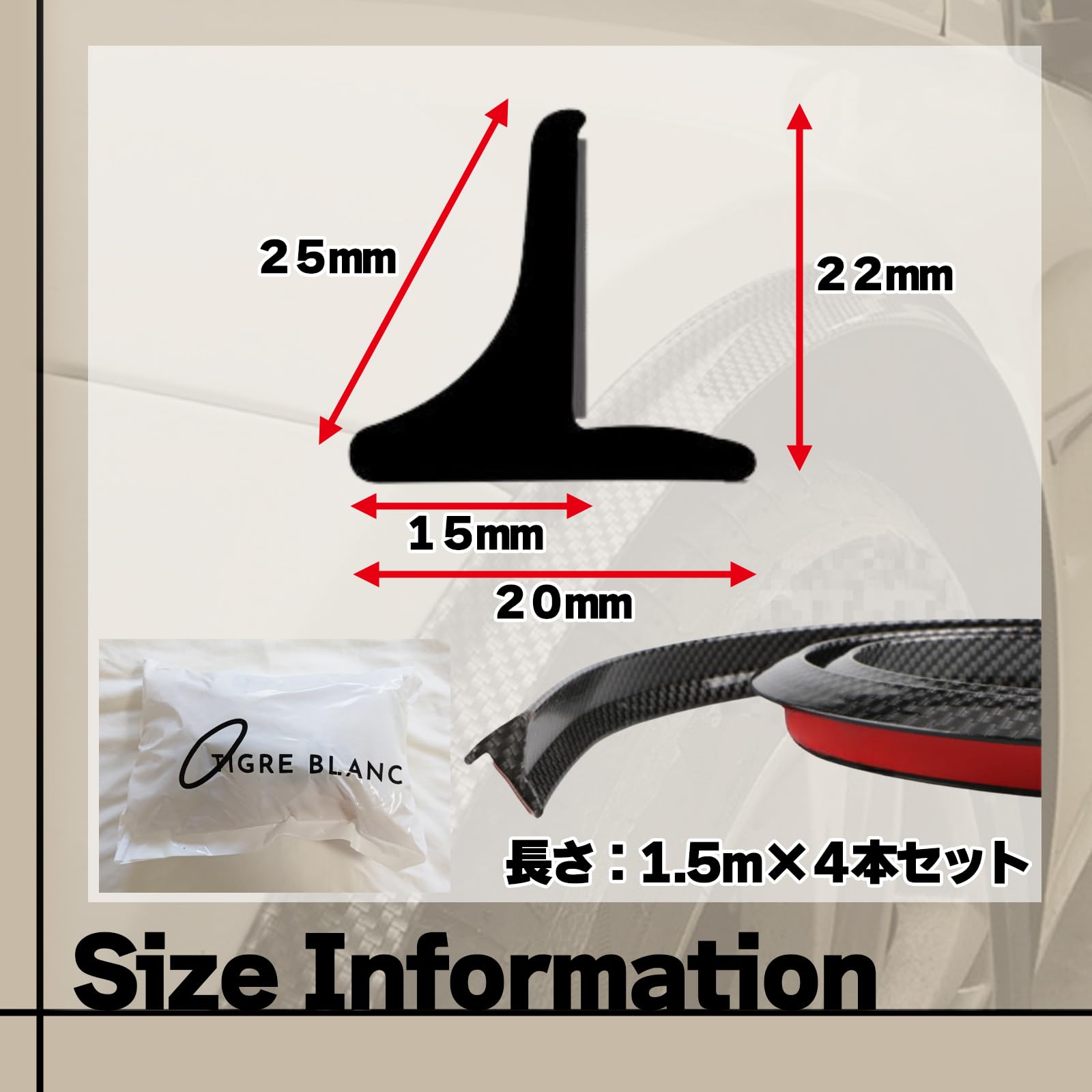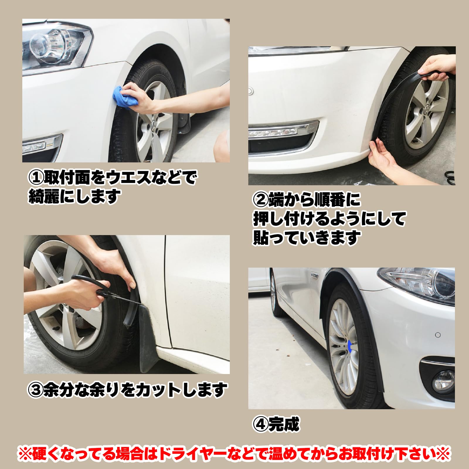 ワイドなタイヤやホイールには必需品。はみだし対策、フェンダーのガリ傷対策としてお使いいただけます。 ※必ず汚れを拭き取って脱脂してからお取り付けください。