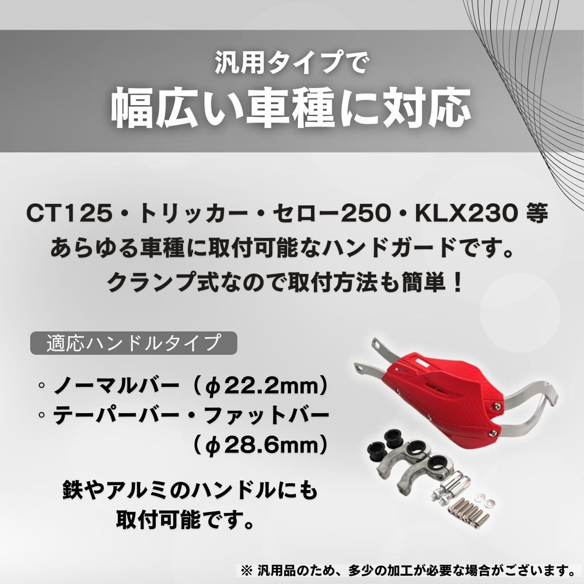 【汎用デザイン】シンプルでちょうどいいサイズ感で、ヤマハ・スズキなどのオートバイはもちろん、オフロード 7/8 22.2mm と 11/8 28.6mmのハンドルにも適用する汎用性のあるナックルハンドガードです。CT125、トリッカー、セロー250、KLX230、ネイキッド、スポーツ、アメリカン、カフェレーサー、クラシック、旧車、スクーターなど、様々な車種のバイクにご利用いただけます。※購入前に必ずご利用車種や本製品サイズ等をご確認の上、ご自身のバイクに装着可能かどうかをご確認ください。車種によっては取り付け時に加工が必要な場合もございます。説明書の添付や取付サポートはございませんので予めご了承くださいませ。