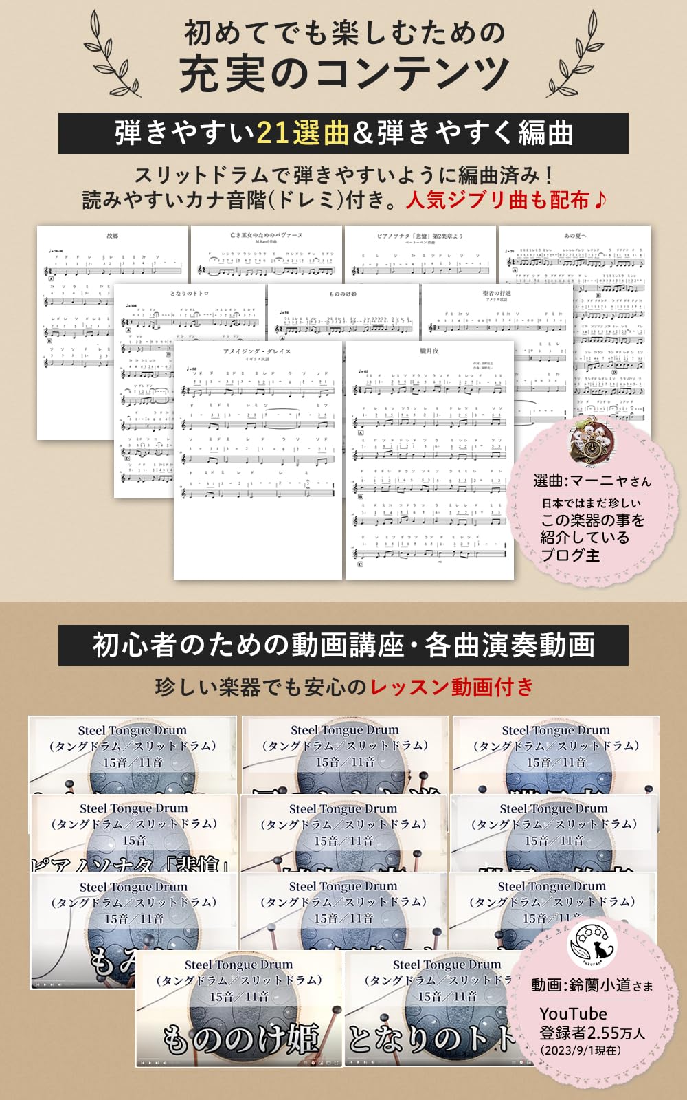 【すぐ楽しめる充実のコンテンツ】スリットドラムの音階に合わせた編曲・選曲を行い22曲の演奏動画と楽譜をご用意しています。詳しい曲目は画像3枚目に記載。