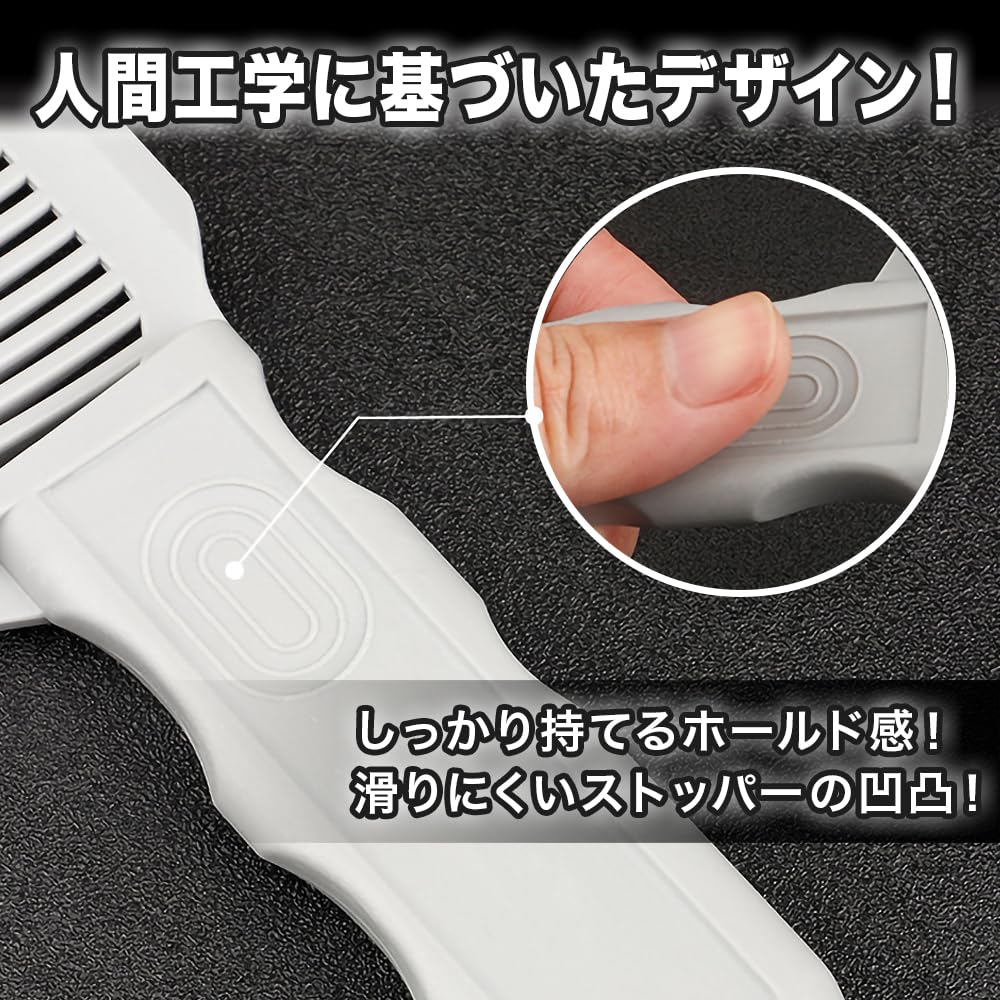 くしの先端は滑らかになっており、頭皮を傷つけず、髪を引っ張ったり絡ませたりしないようにV字型になるよう角度をつけています。