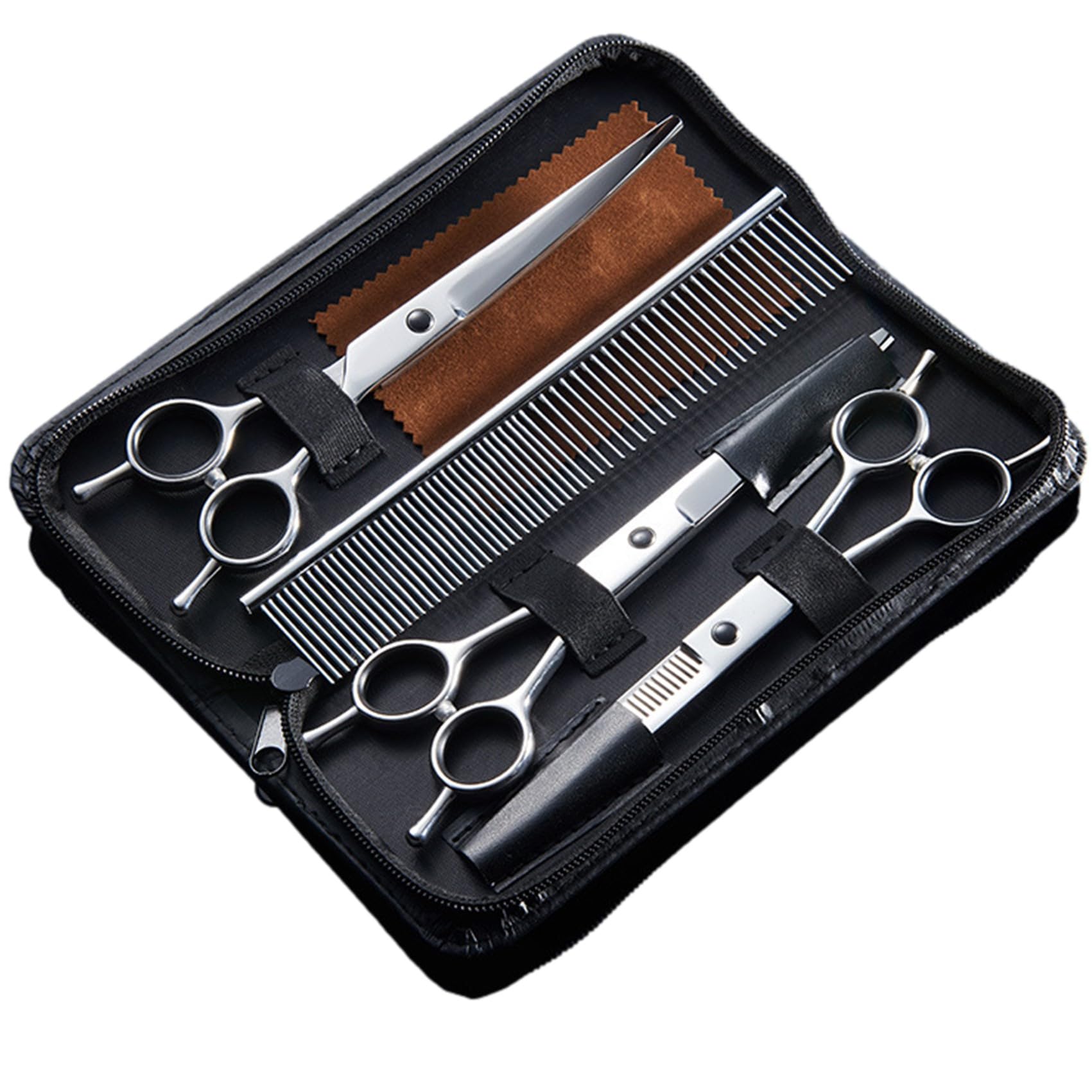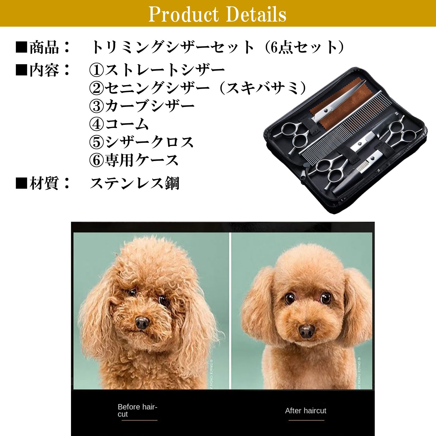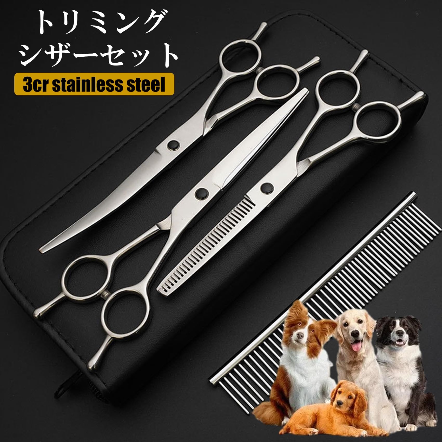 【商品詳細】 ■商品: トリミングシザーセット(6点セット) ■セット内容: ①ストレートシザー ②セニングシザー(スキバサミ) ③カーブシザー ④コーム ⑤シザークロス ⑥専用ケース ■材質: 3crステンレス鋼