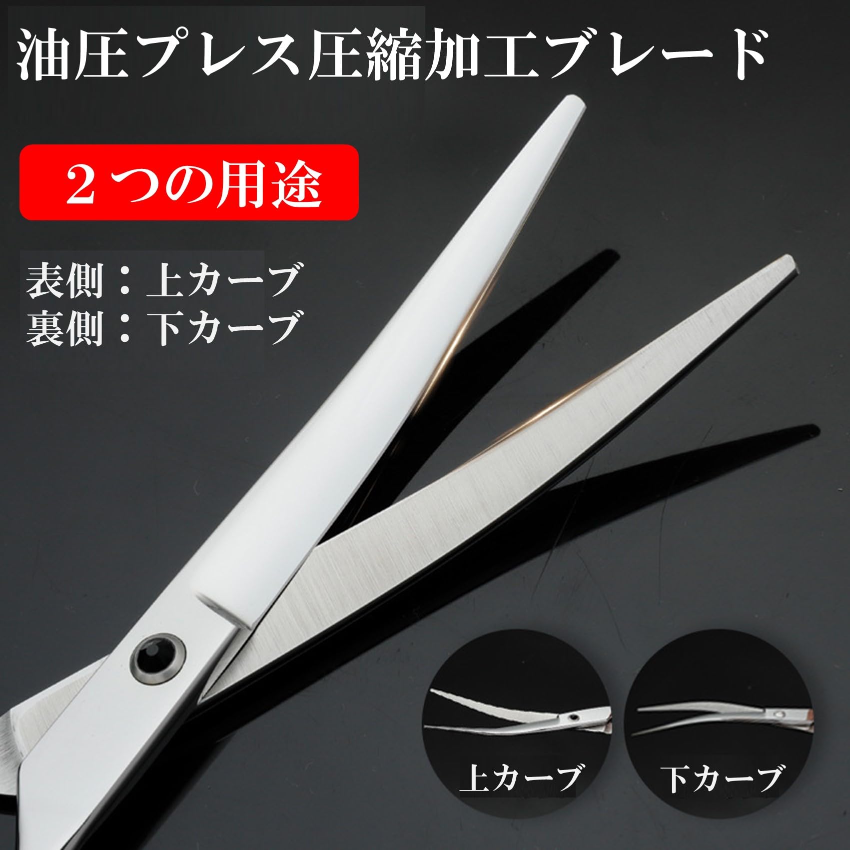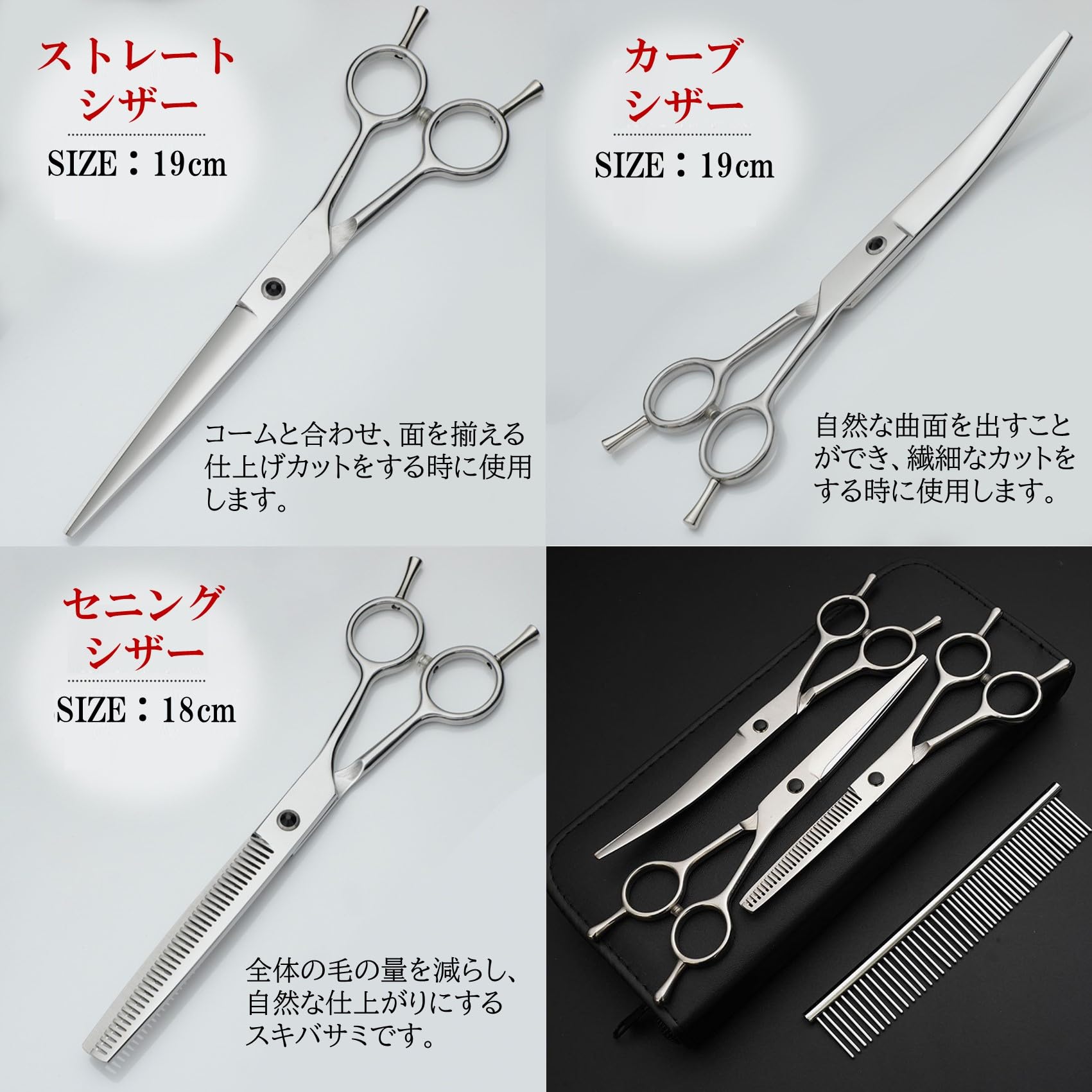 【各種シザーの用途】 ストレートシザー(約19cm)はコームと合わせ、面を揃える仕上げカットをする時に使用します。カーブシザー(約19cm)は自然な曲面を出すことができ、繊細なカットをする時に使用します。裏表で上カーブ下カーブの使い分けが可能です。セニングシザー(約18cm)は全体の毛の量を減らし自然な仕上がりにするスキバサミです。