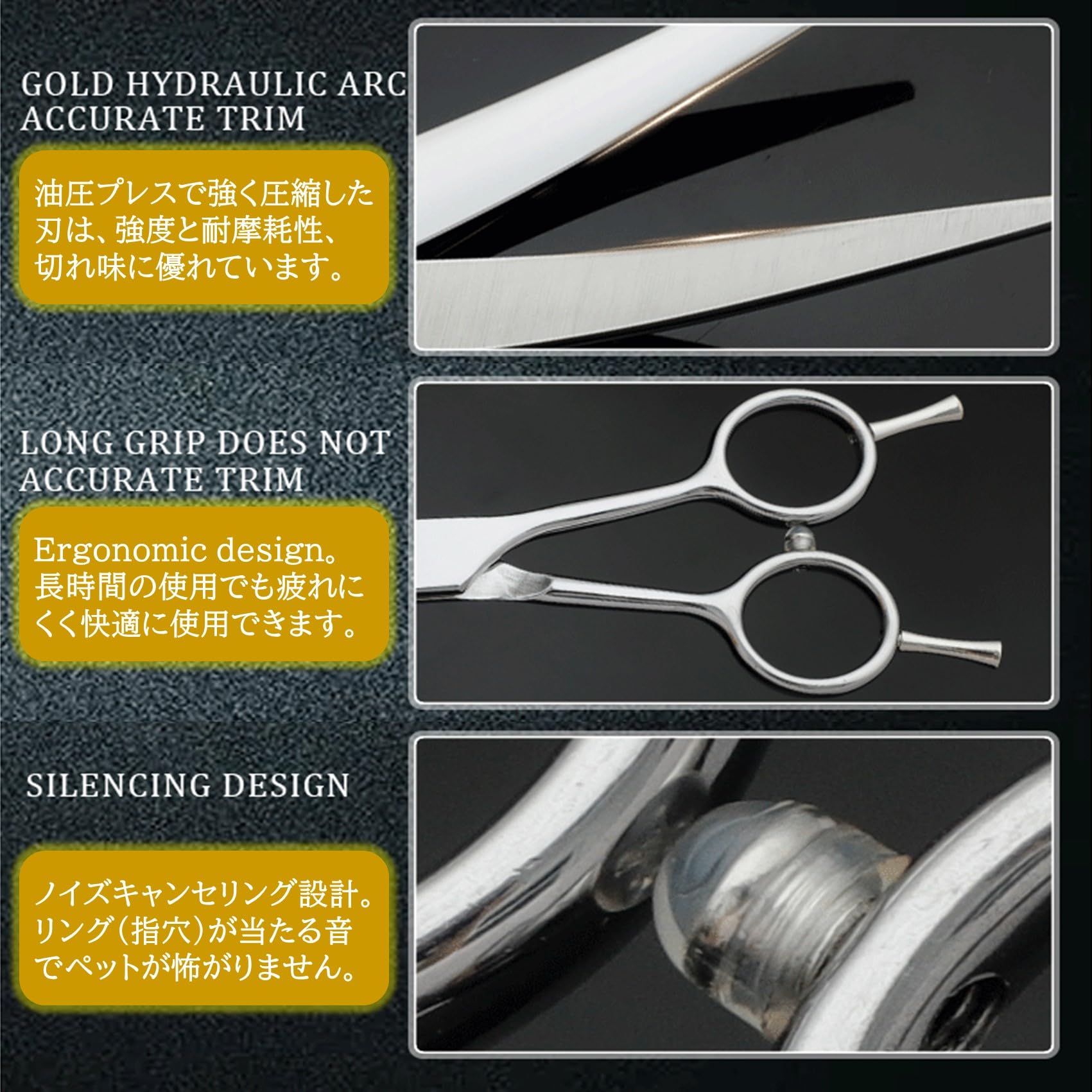 【シザーの3POINT】 ブレードは油圧プレスで強く圧縮し、強度と耐摩耗性、切れ味に優れています。ハンドルはErgonomicDesign(人間工学)で長時間の使用でも疲れにくく操作性に優れ快適に作業を行うことができます。リング(指穴)の接触点はノイズキャンセリング設計となっており、金属が当たる音でペットが怖がることがありません。