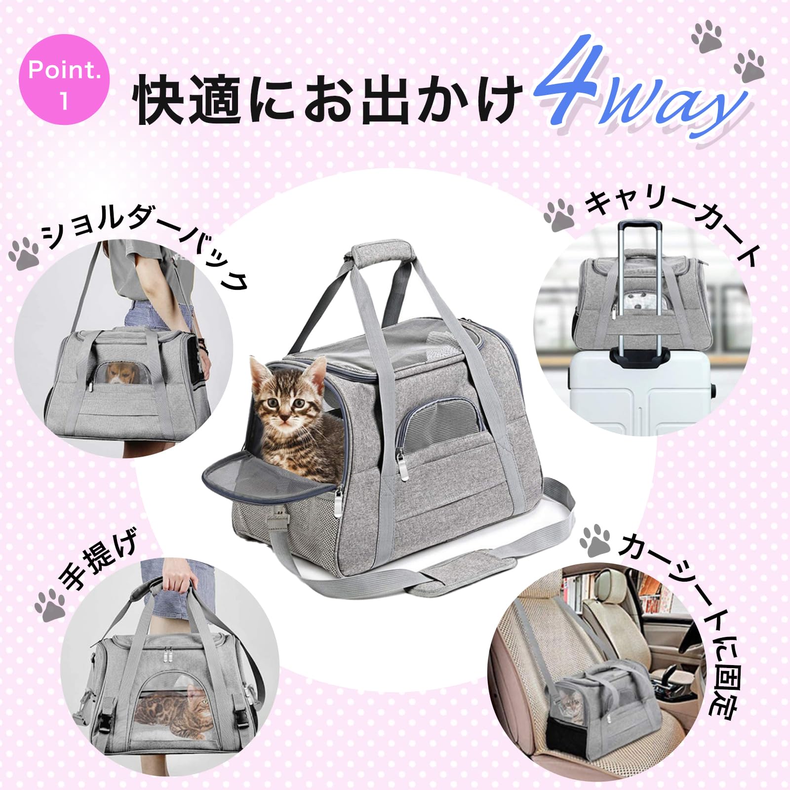 ペットキャリーバッグが、ペットとのお出かけを一段と快適に変えます。折りたたみ可能でコンパクトなデザイン、優れた通気性、反射テープ付きで安全性も抜群。外出時のペットとの不便さを解消します。///快適なキャリーストラップ、双方向スライダー、強力なバックルが、運びやすさと安全性を両立。日常のお出かけから旅先に最適です。///バッグが変形しないよう工夫されたファスナー部分には、ワイヤーとサポート用の裏地があり、強くて変形しにくい。両側のジッパー開口部はペットの出入りをスムーズにし、アタッチメント付きのタグがバッグに固定できます。///さらに、長さ調整可能なロングショルダーストラップ、高品質なオックスフォード生地、セルフロックジッパー、通気性のあるメッシュなど、細部にわたり高い品質が保たれています。///耐荷重量概ね4.5KG以下で、犬や猫に最適。生活防水の内部コーティングも備え、ペットとのお出かけがより便利になります。
