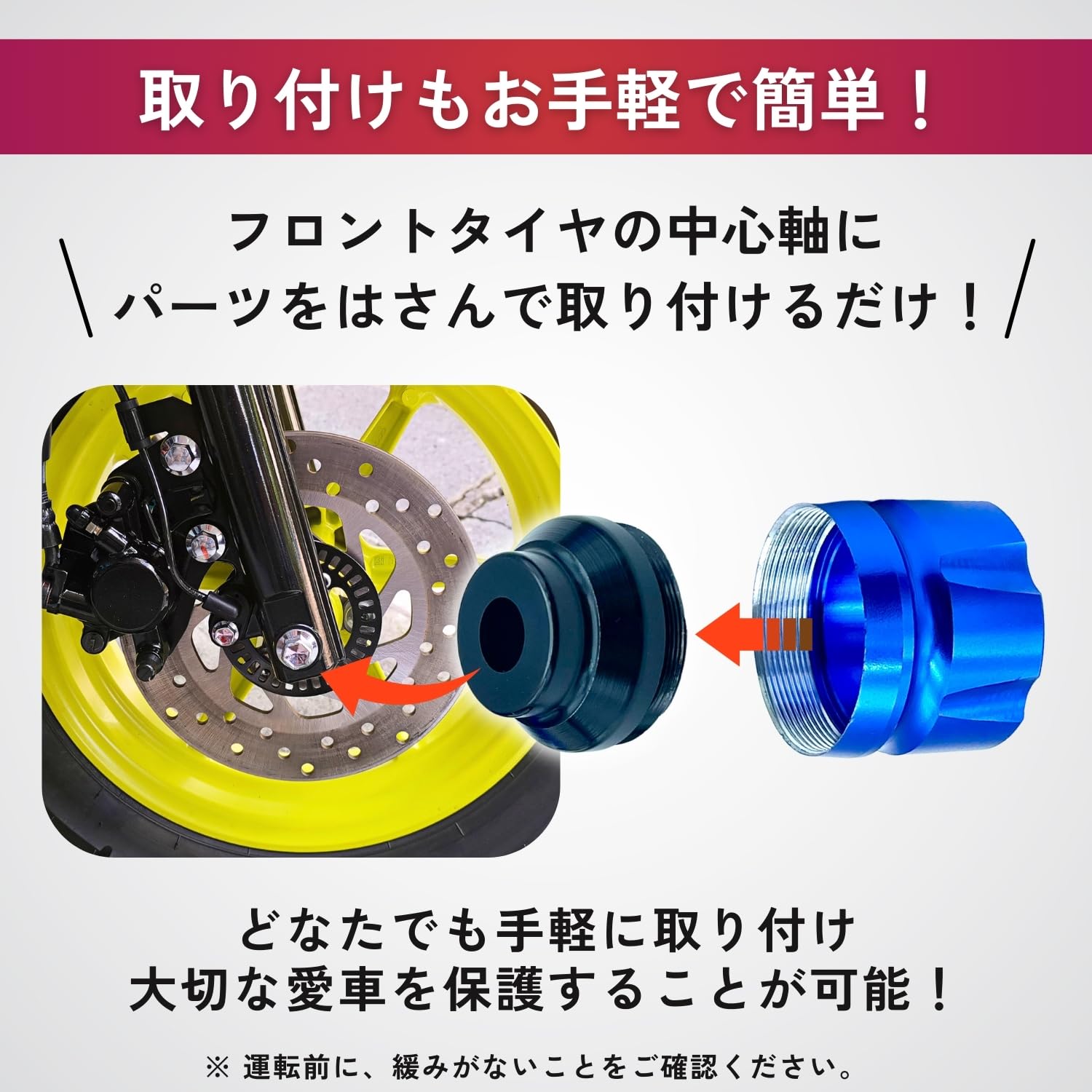 ?穴径約12mmです。適応サイズであれば、どのようなバイクでも取り付け可能な汎用タイプです。フロントタイヤの中心軸に黒部分パーツを共締めするだけのため女性の方でも取り付け可能となっております。
