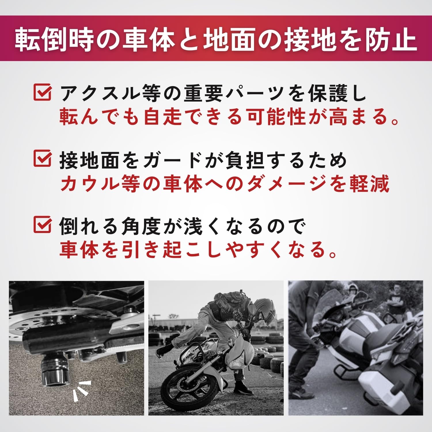 ?約50mm程度の飛びだしがあるため、立ちゴケや転倒の際アクスルシャフトだけでなくエンジンなど重要パーツもしっかりガードします!