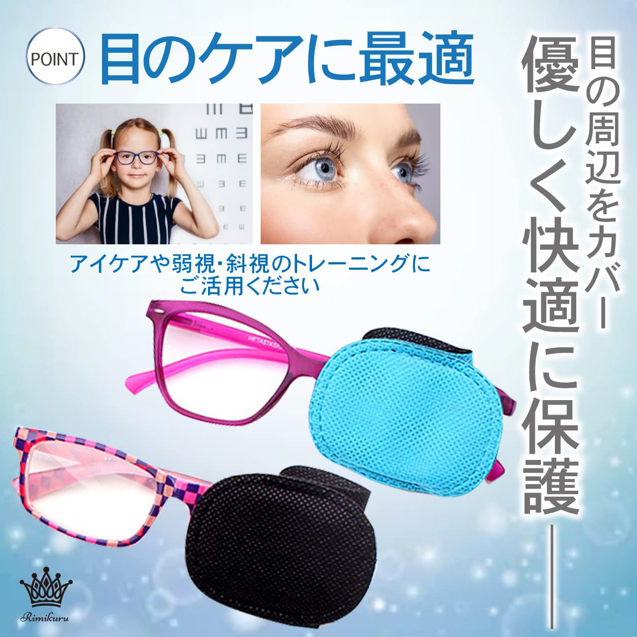 目のケアに最適:こちらの眼帯 メガネカバーはスライドさせるだけで取り付け・取り外しができるので、簡単に目の周辺をカバーし優しく快適に保護します。普段のアイケアや弱視、斜視のトレーニングなどにご活用ください。