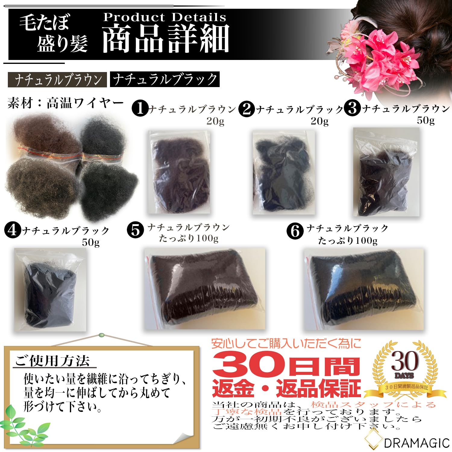 【数量限定】DRAMAGIC 毛たぼ 盛り髪 お団子 お団子ウィッグ 毛タボ すき毛 盛り髪ベース ポイントヘアセット (ナチュラルブラック 20g)