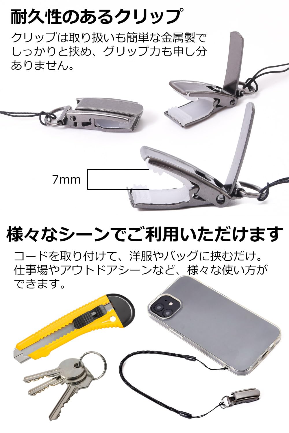 スマホ、鍵、カッター、歩数計、メジャーなど様々なシーンでご利用いただけます。