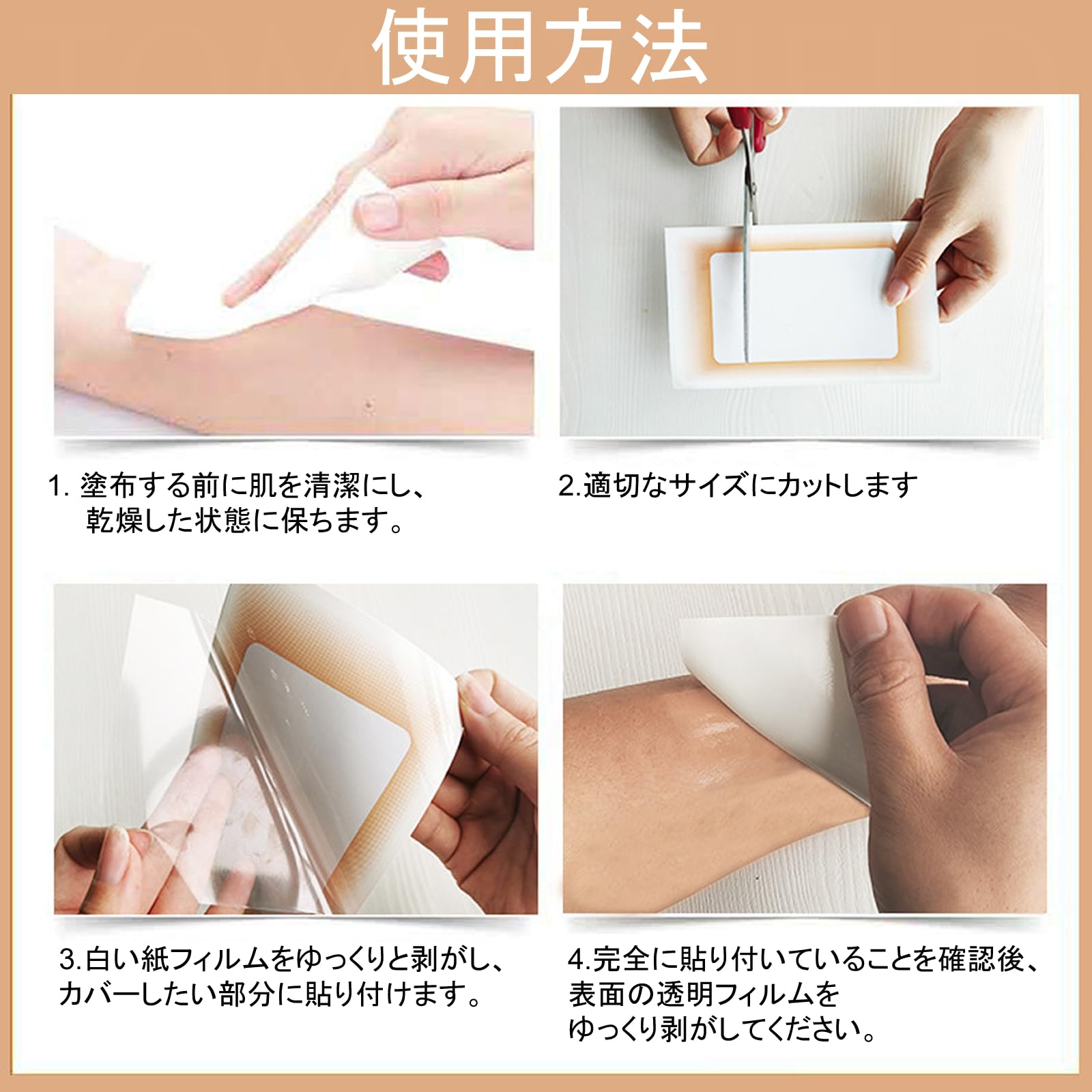 商品説明文1: タトゥーや傷跡を瞬時に隠せる防水傷隠しテープです。皮膚にピタッとフィットするため、温泉や銭湯での使用も安心です。傷や入れ墨を一時的に隠したい方におすすめです。