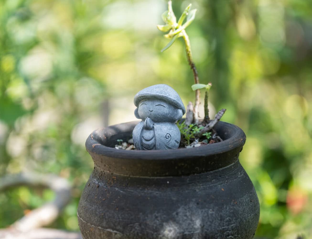 【店主からのメッセージ】:店主は京都の寺院を訪れた際、可愛らしい小さな僧侶や地蔵菩薩の石像を発見し、面白く美しい意味を感じました。帰宅後、名工の彫刻模型を探し、砂岩合成技術を使用して美しい小さな飾りを制作しました,白御影石で作られた手のひらにのせられる小柄なお地蔵さんです。